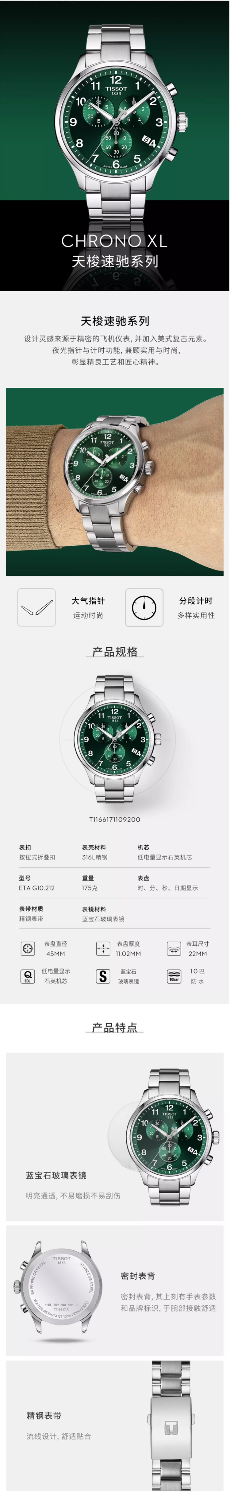 TISSOT天梭 速驰系列钢带石英男士腕表 T116.617.11.092.00(单位:块) 绿色
