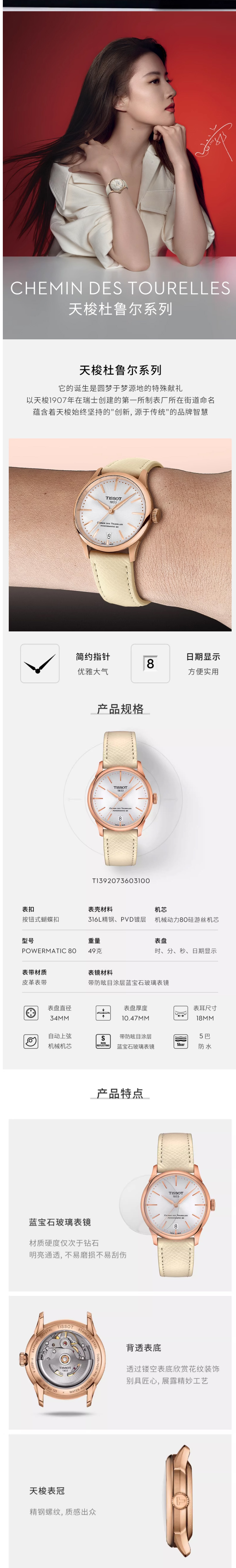 TISSOT天梭 杜鲁尔机械女士腕表(刘亦菲同款) T139.207.36.031.00(单位:块) 金色