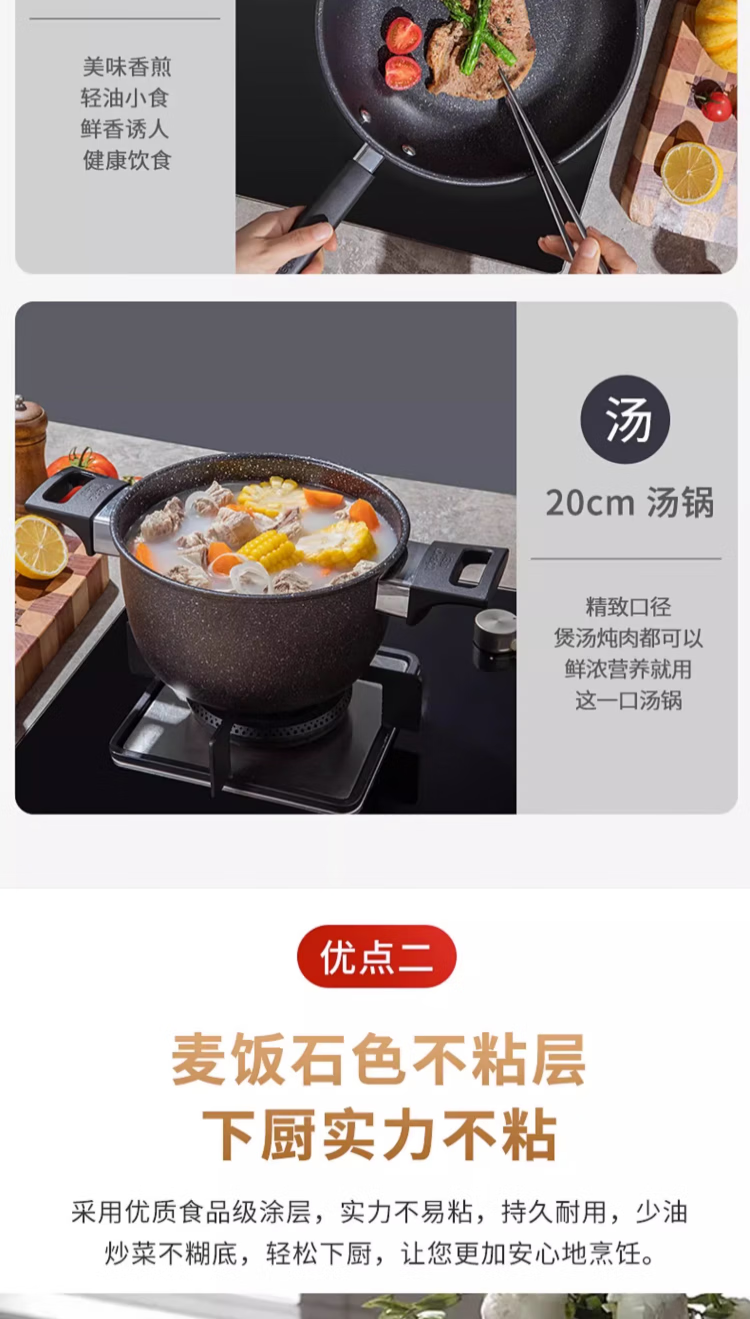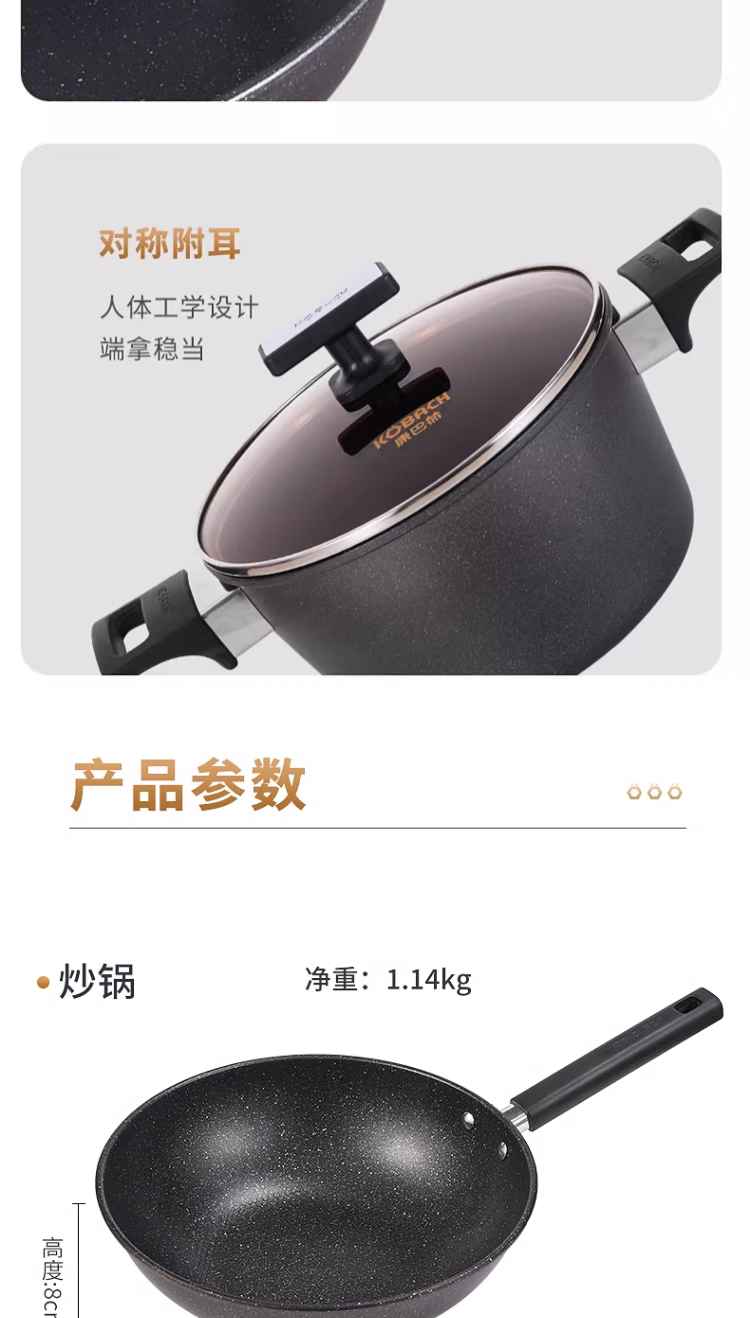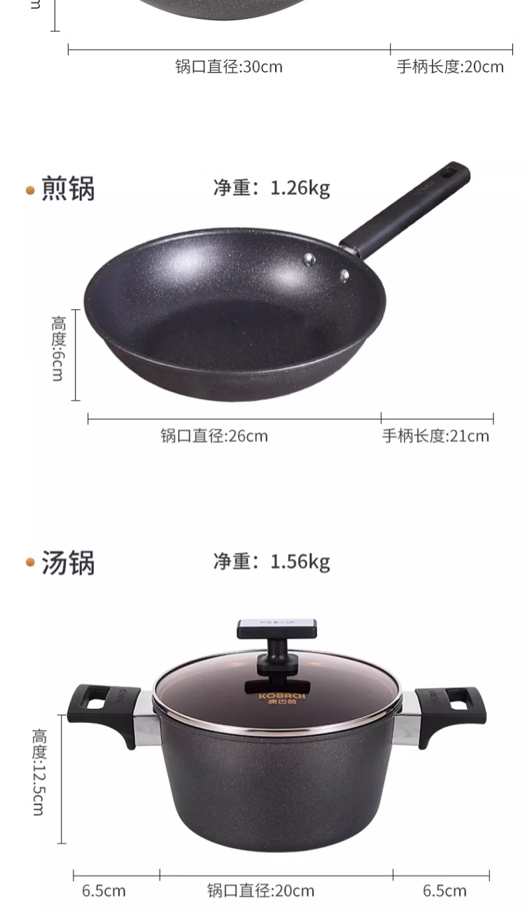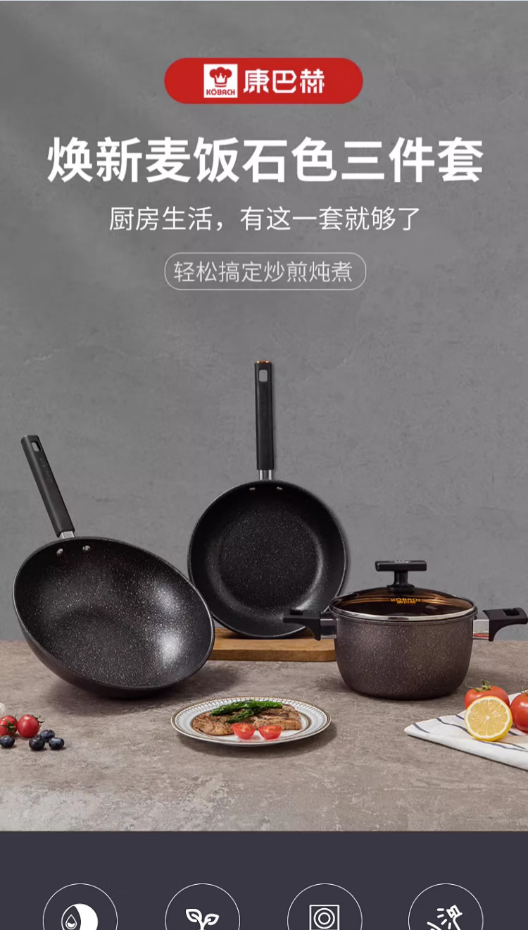康巴赫焕新麦饭石色三件套30cm炒锅+26cm煎盘+20cm汤锅KGM-T03(14010008)套 麦饭石色