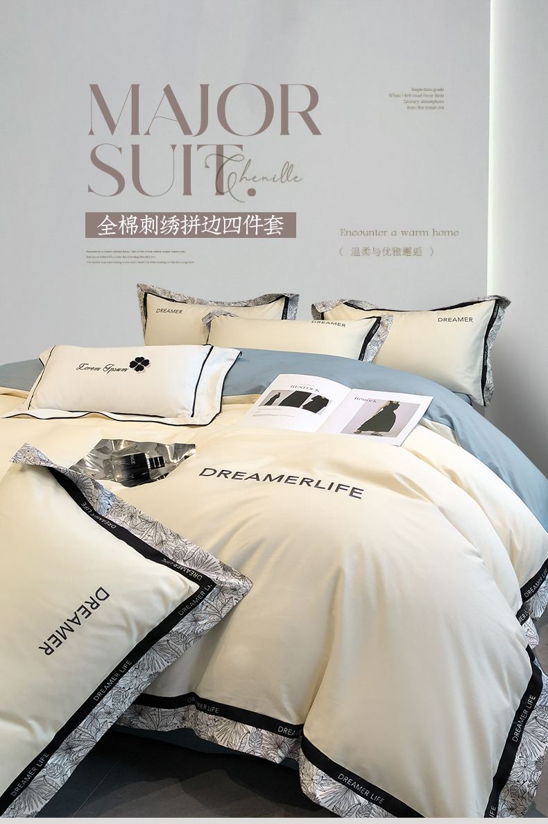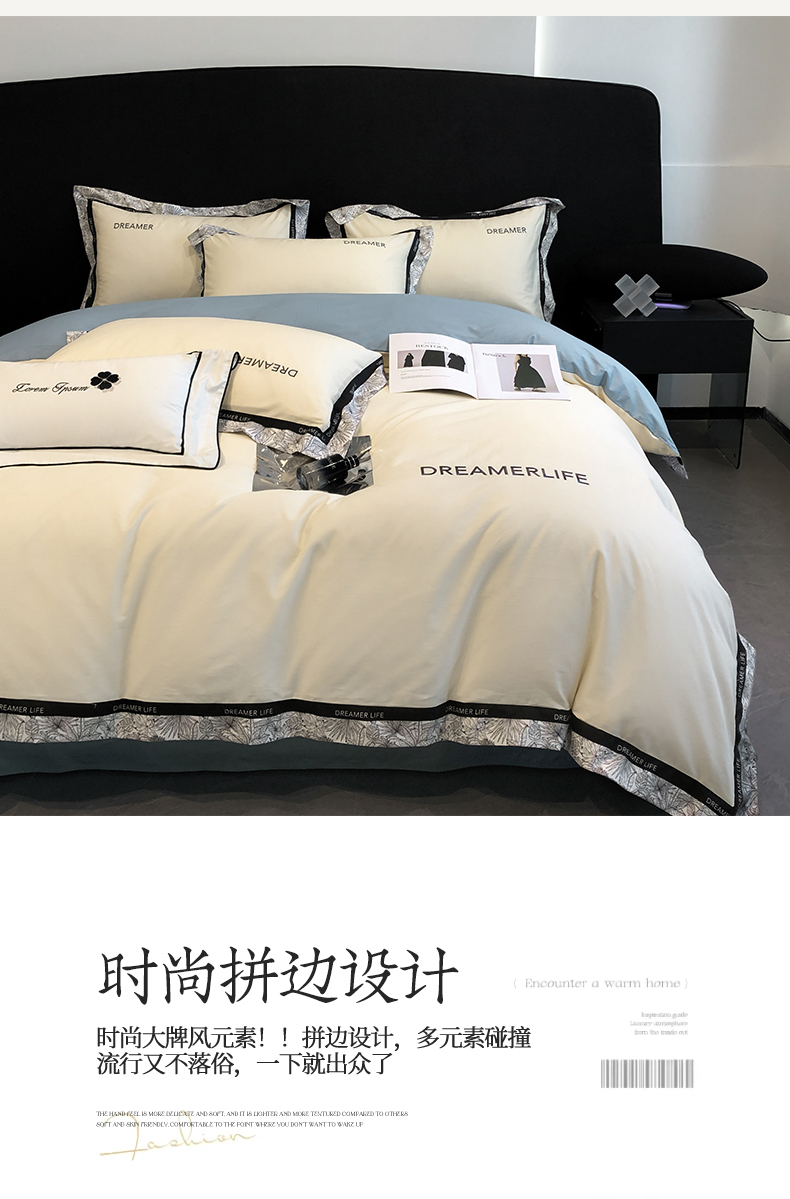 帛享家纺 全棉刺绣拼边四件套 单位(套)BXCSY-41451 中灰+山灰 被套200*230CM四件套