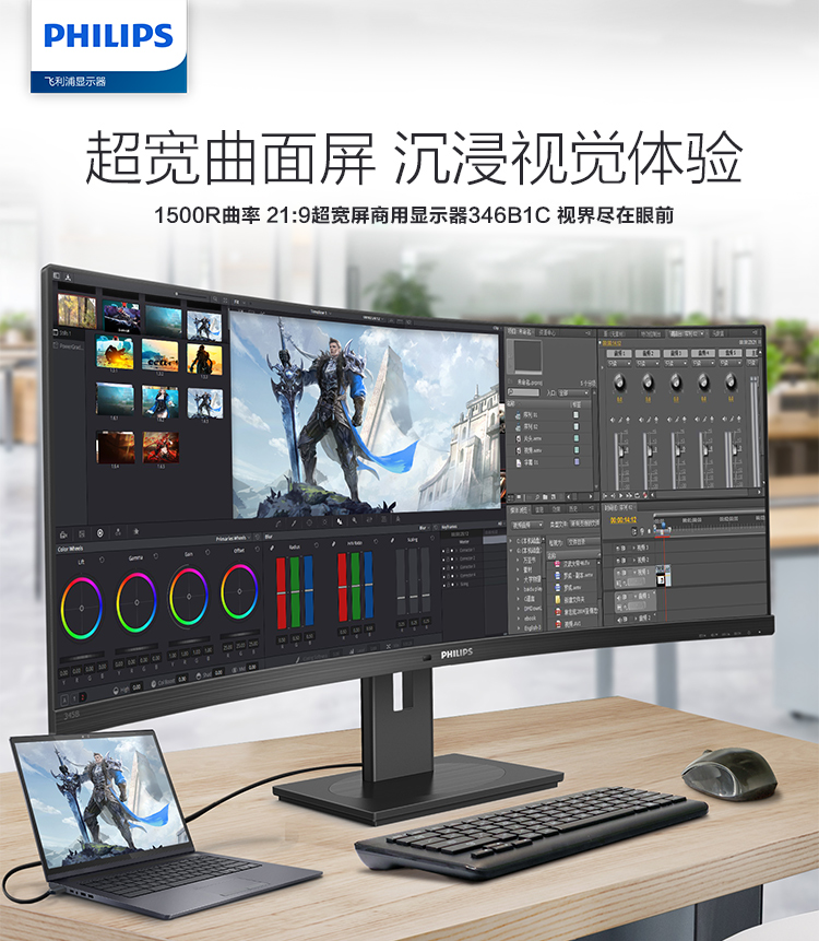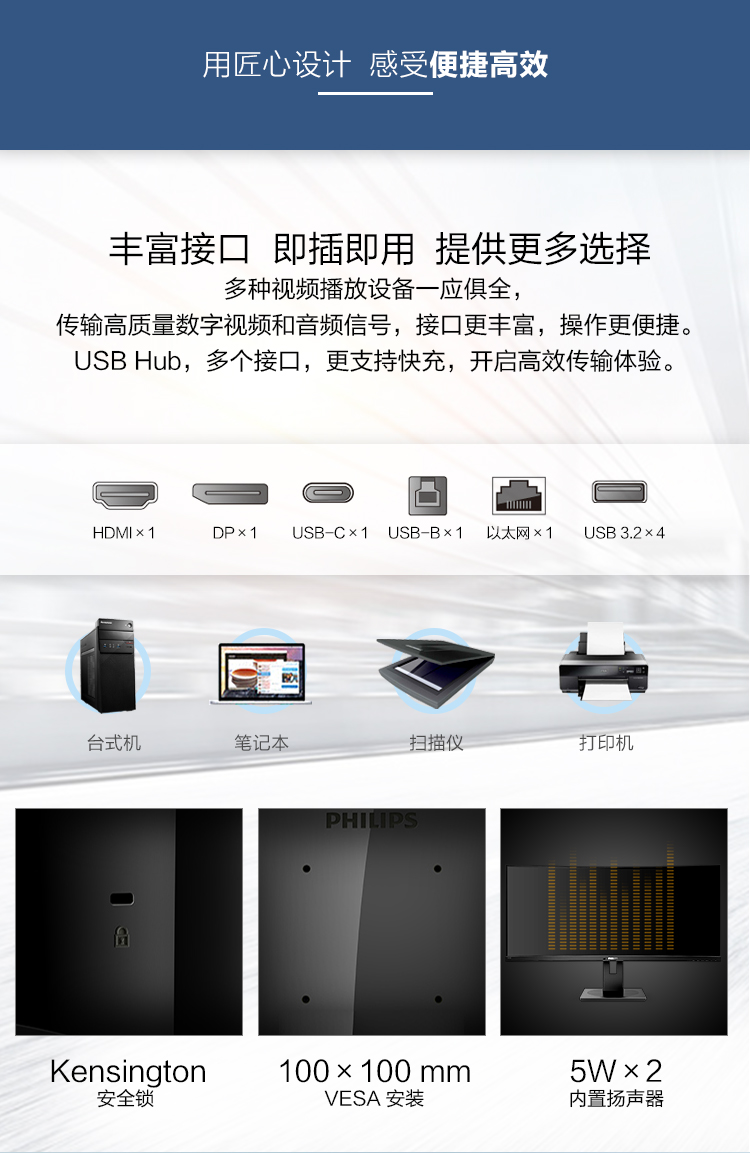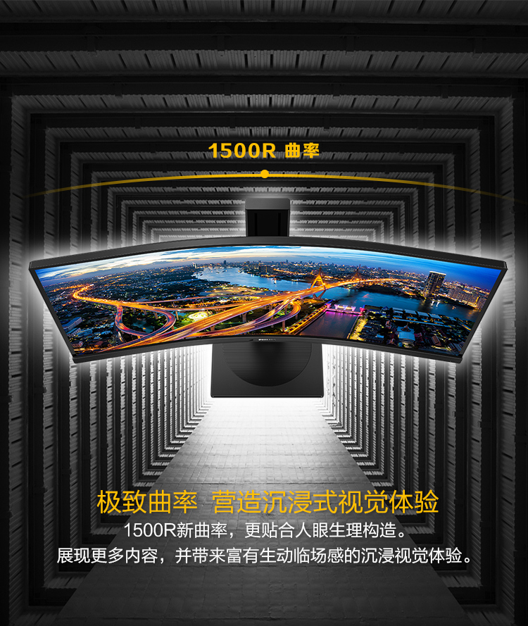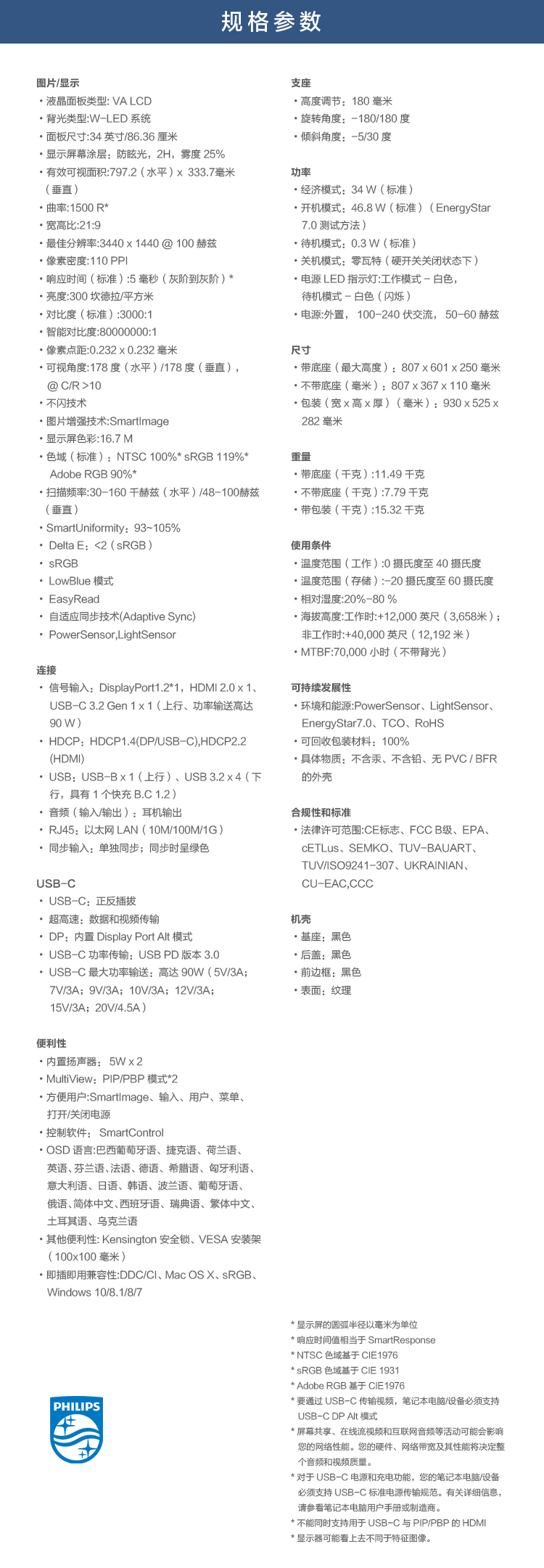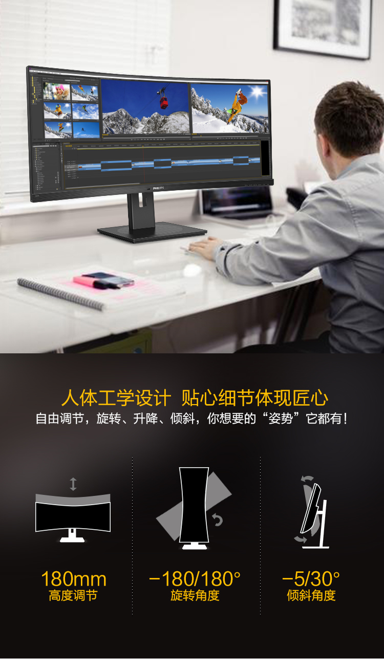 飞利浦34英寸曲面显示器21:9宽屏1500R带鱼屏2K100Hz Type-C 90W办公商用屏台 黑色