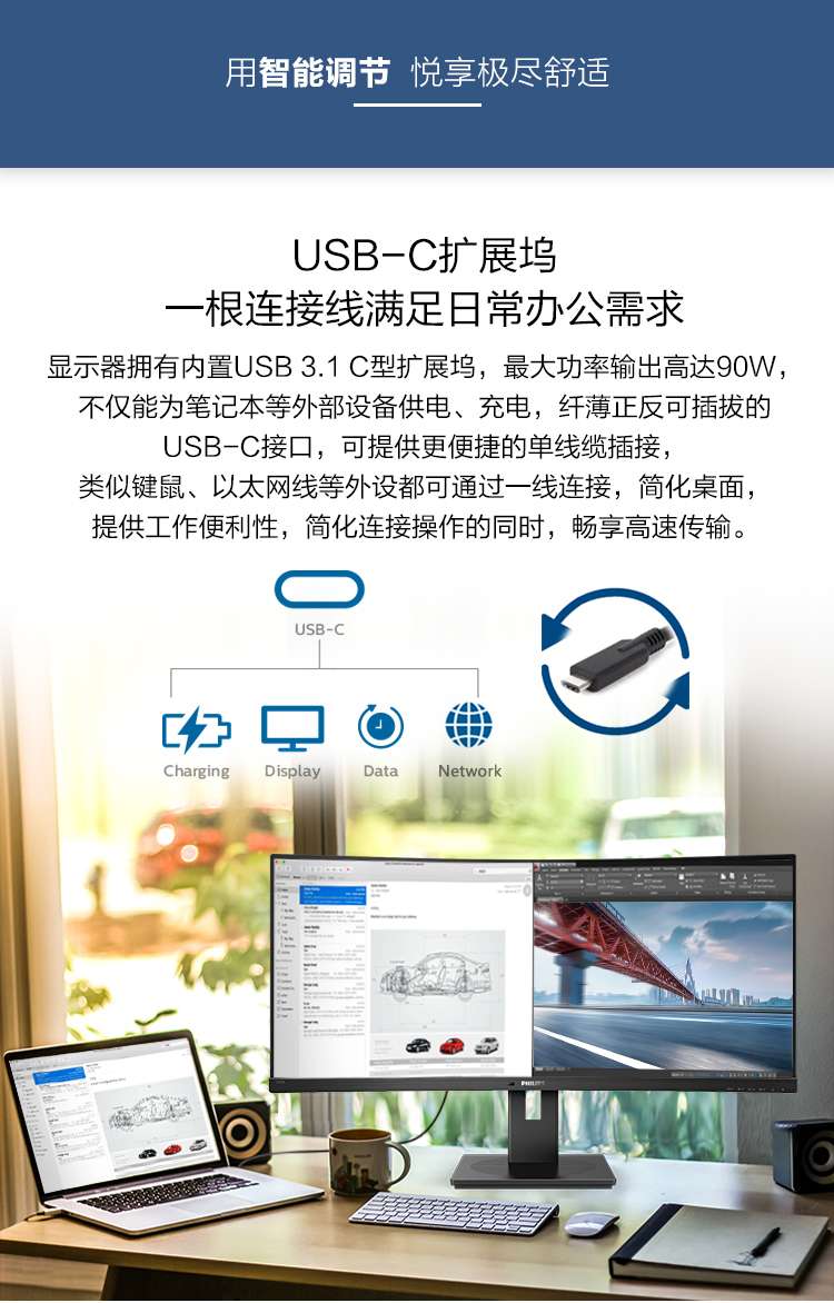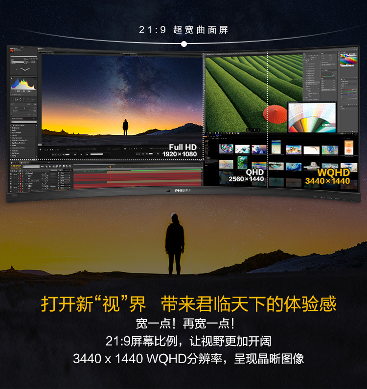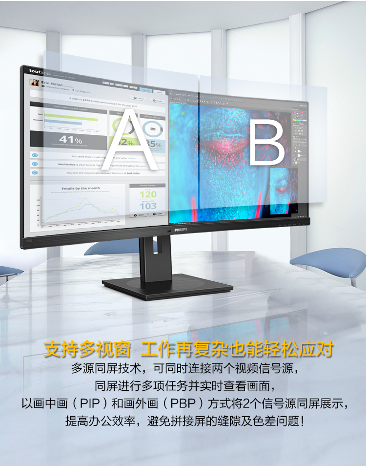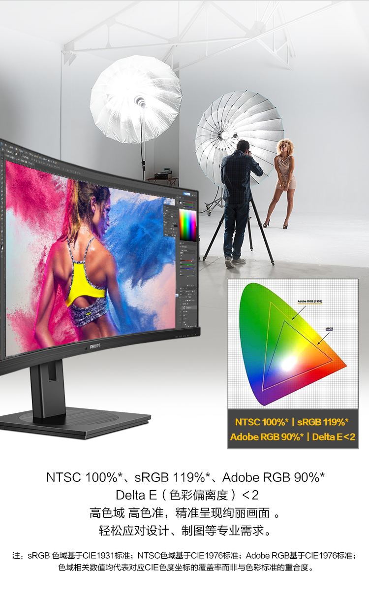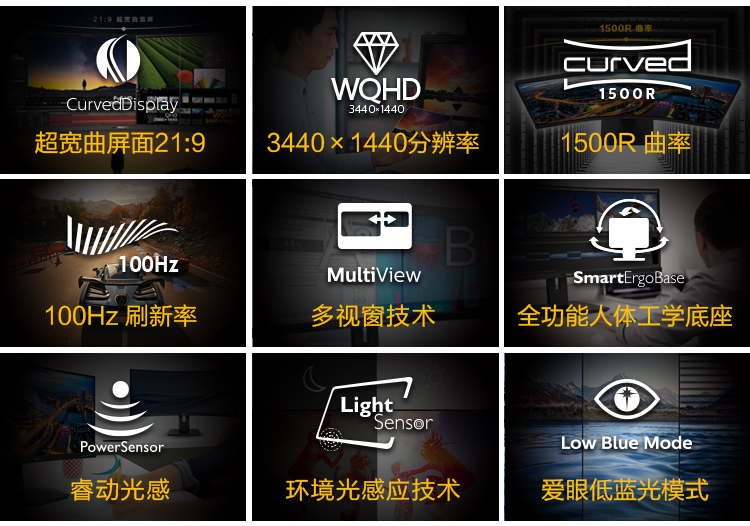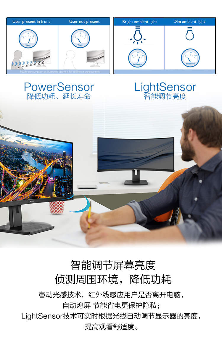 飞利浦34英寸曲面显示器21:9宽屏1500R带鱼屏2K100Hz Type-C 90W办公商用屏台 黑色
