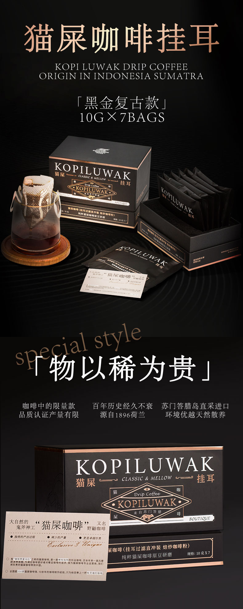 野鼬咖啡-猫屎咖啡连锁&佑晨光-印尼麝香猫猫屎精品挂耳手冲黑咖啡礼盒装进口生豆 10g*7/盒(黑礼 曜石黑