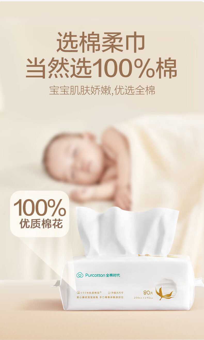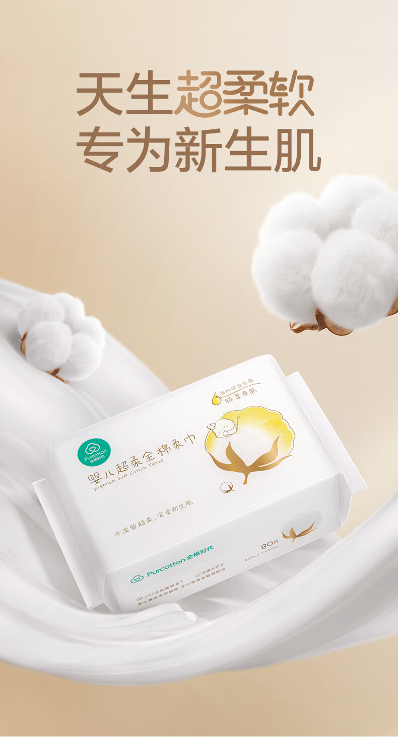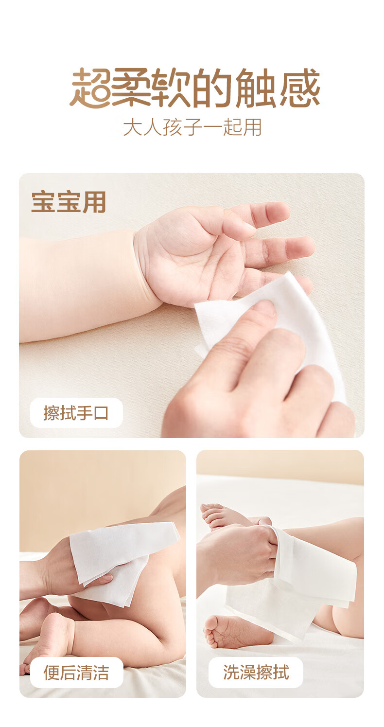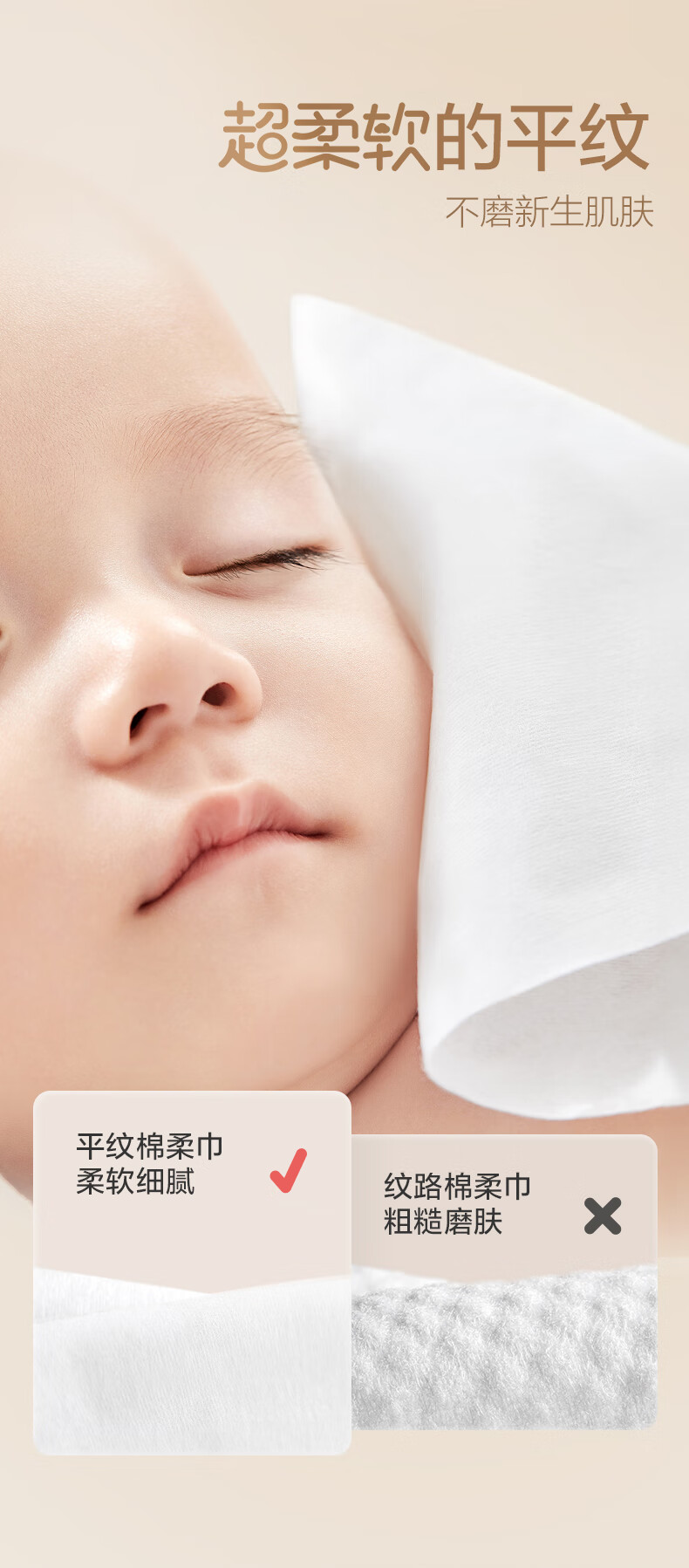 全棉时代婴儿超柔全棉柔巾50gsm平纹 200×150mm,80片/包,3包/袋(单位:袋) 象牙色