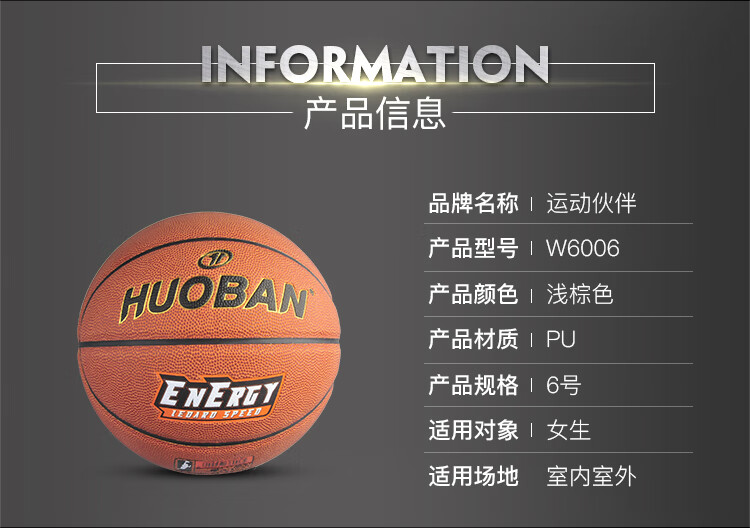 运动伙伴 篮球6号女子学生用球室内外通用篮球PU+橡胶 HB6006 个 褐色