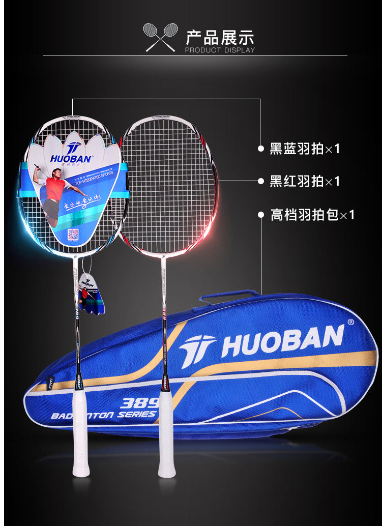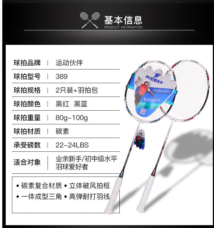 运动伙伴 碳素套拍羽毛拍全碳素穿线比赛运动器材羽拍(大包) 389 两只装 白色