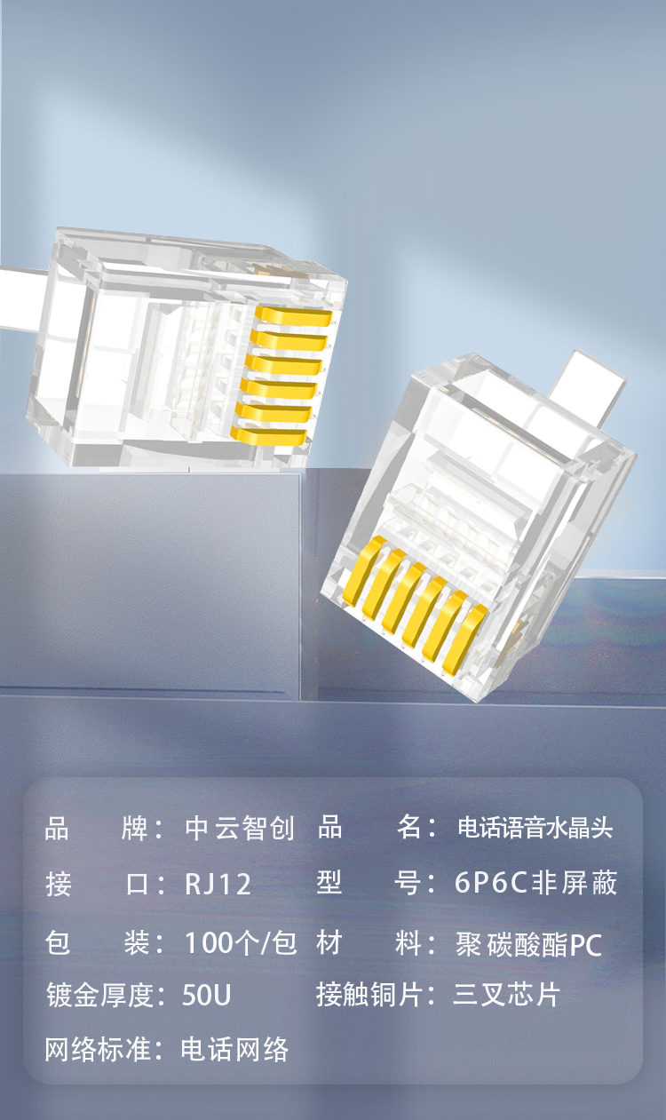 中云智创 6芯电话水晶头 6P6C电话语音水晶头RJ12水晶头50U镀金100个/包 无色