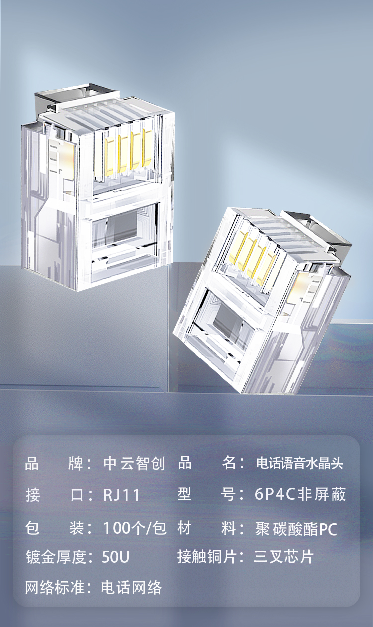 中云智创 4芯电话水晶头 6P4C电话语音水晶头RJ11水晶头50U镀金100个/包 无色