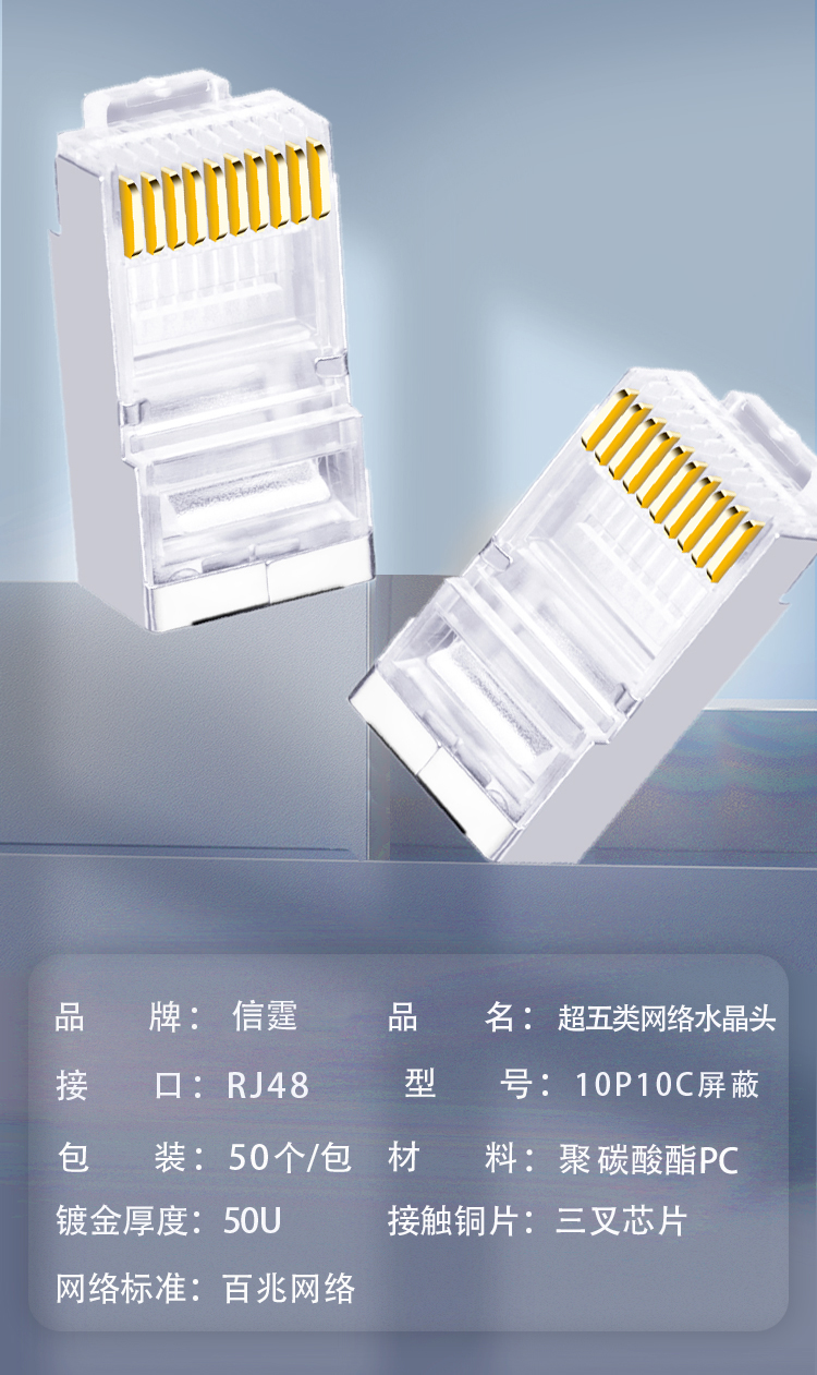 信霆 十芯水晶头 RJ48屏蔽水晶头10P10C镀金50U扫描仪通用 50只/包 无色