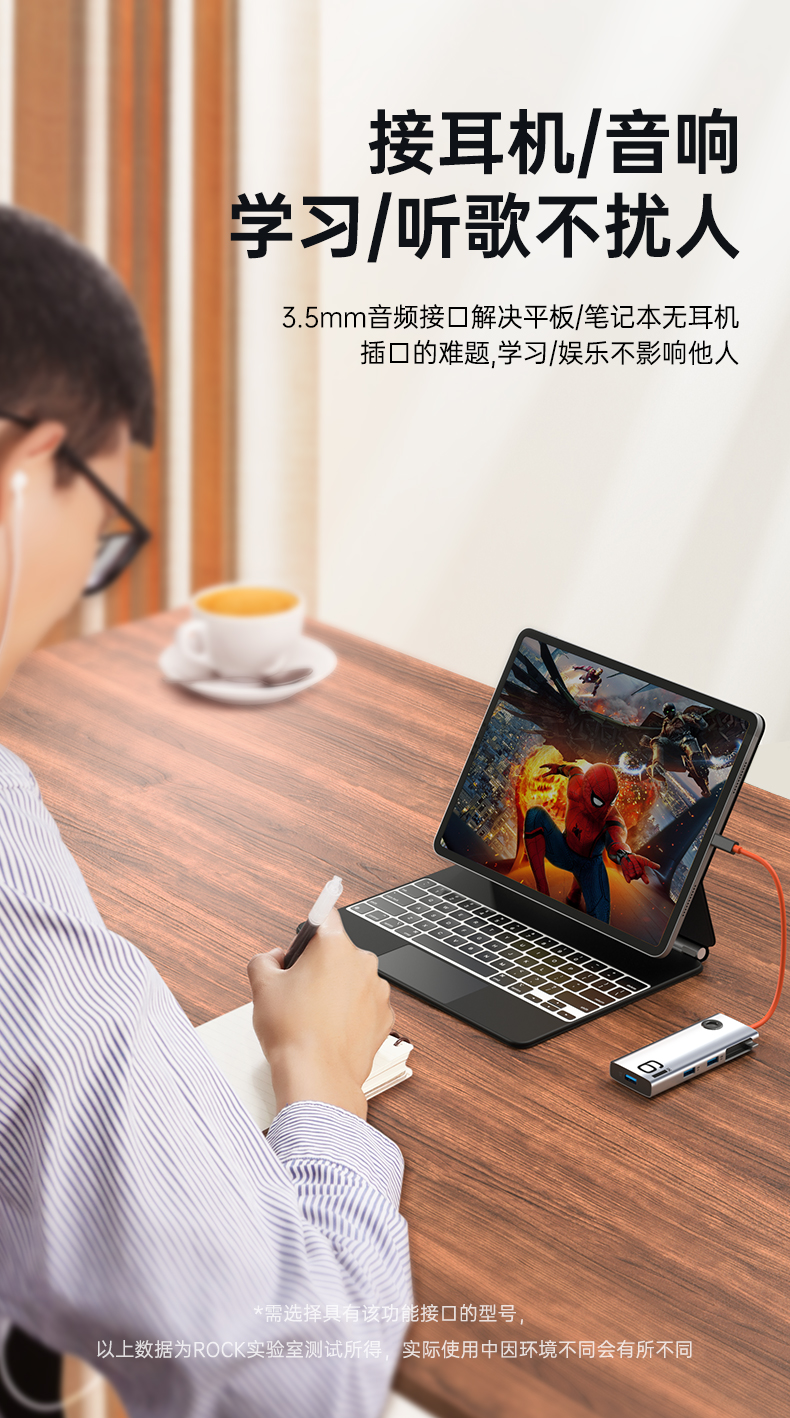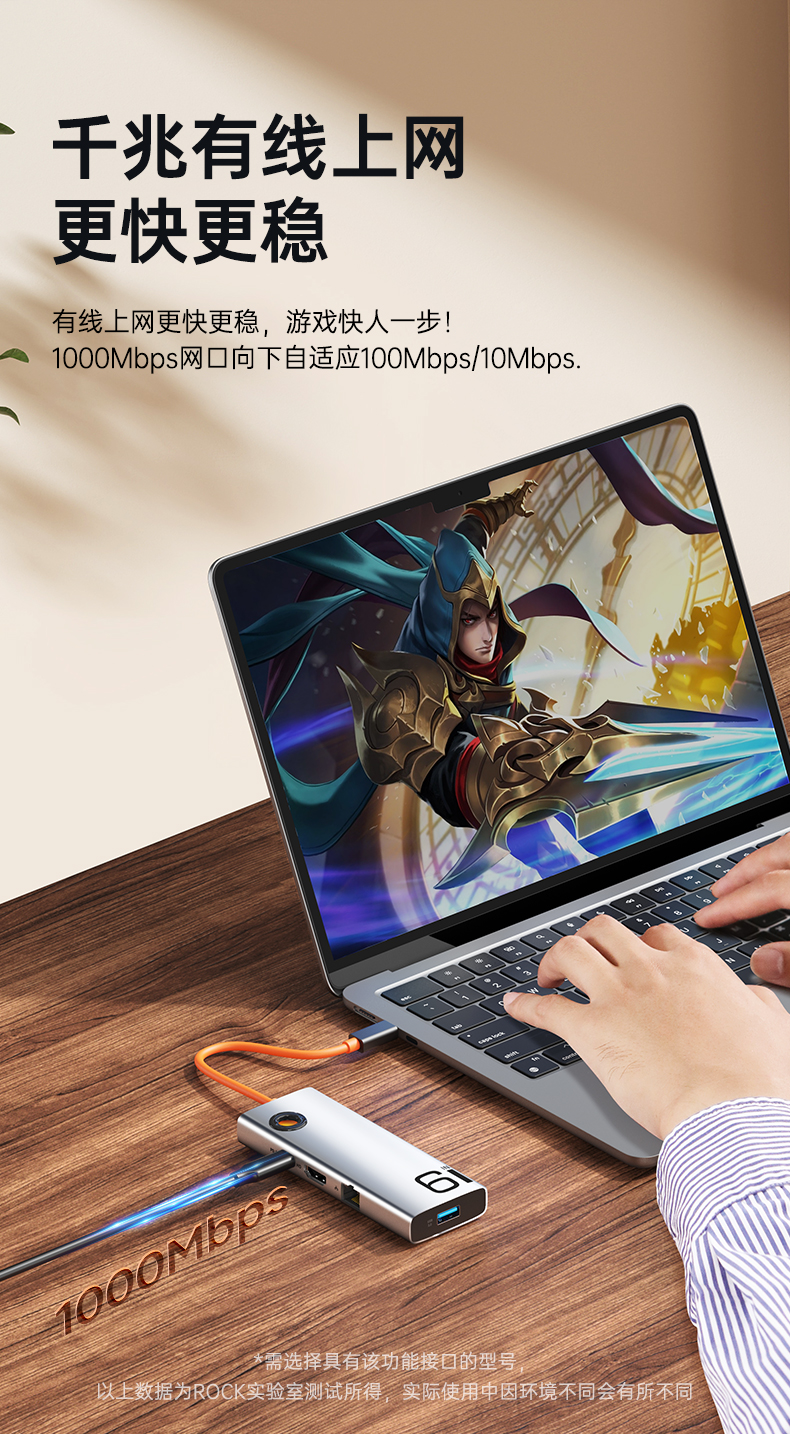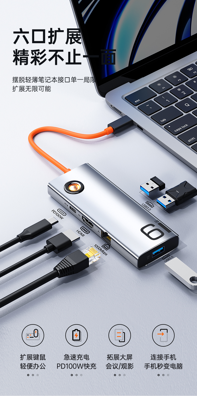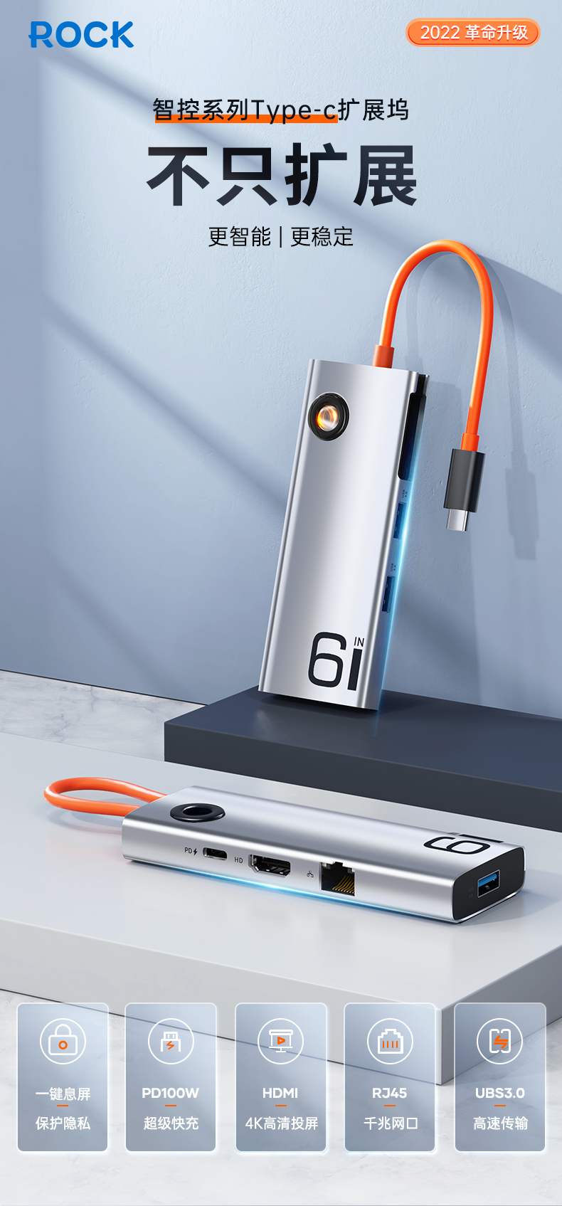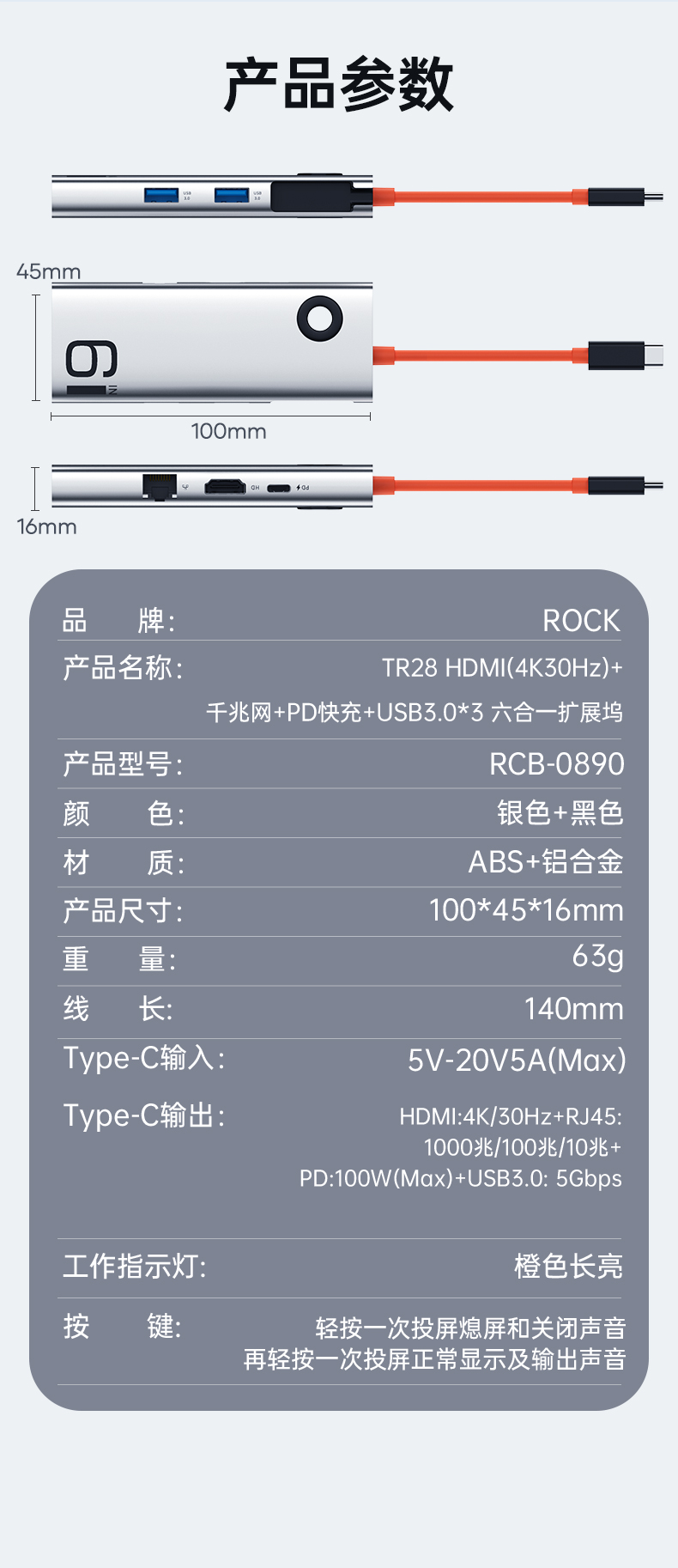 洛克(ROCK) TR32 TR28 HDMI(4K30Hz)+千兆网+PD快充+USB3.0*3 六合一扩展坞 RCB-0890(单位:个) 银色+黑色