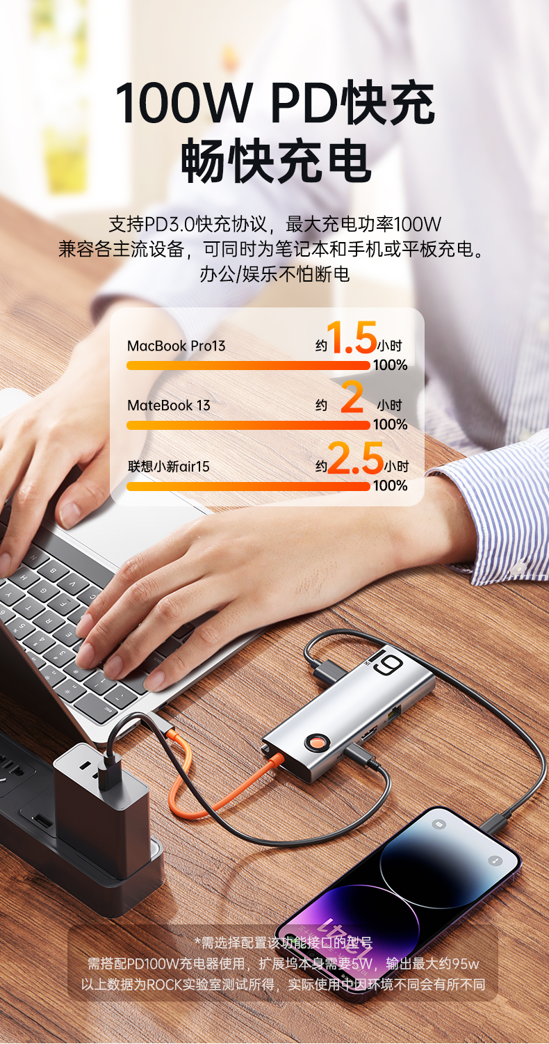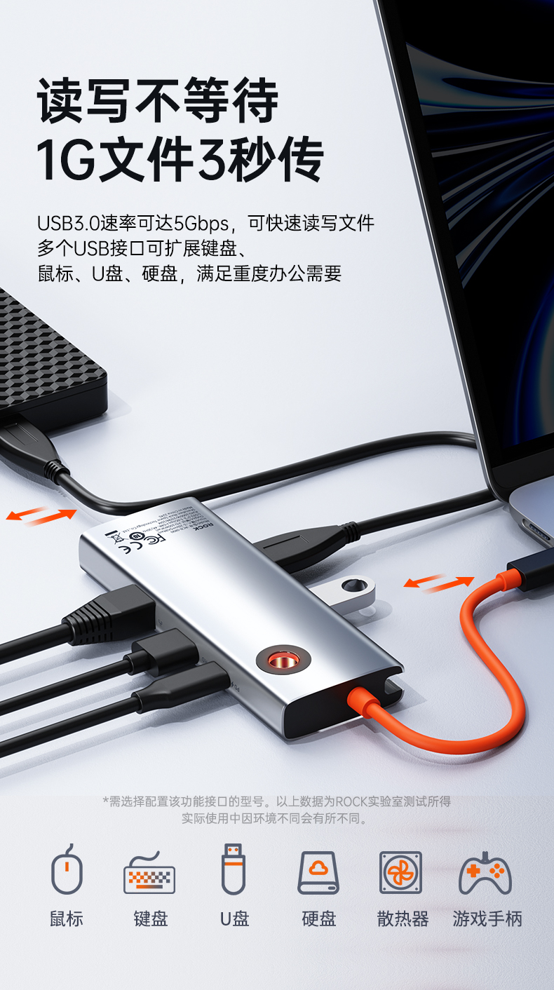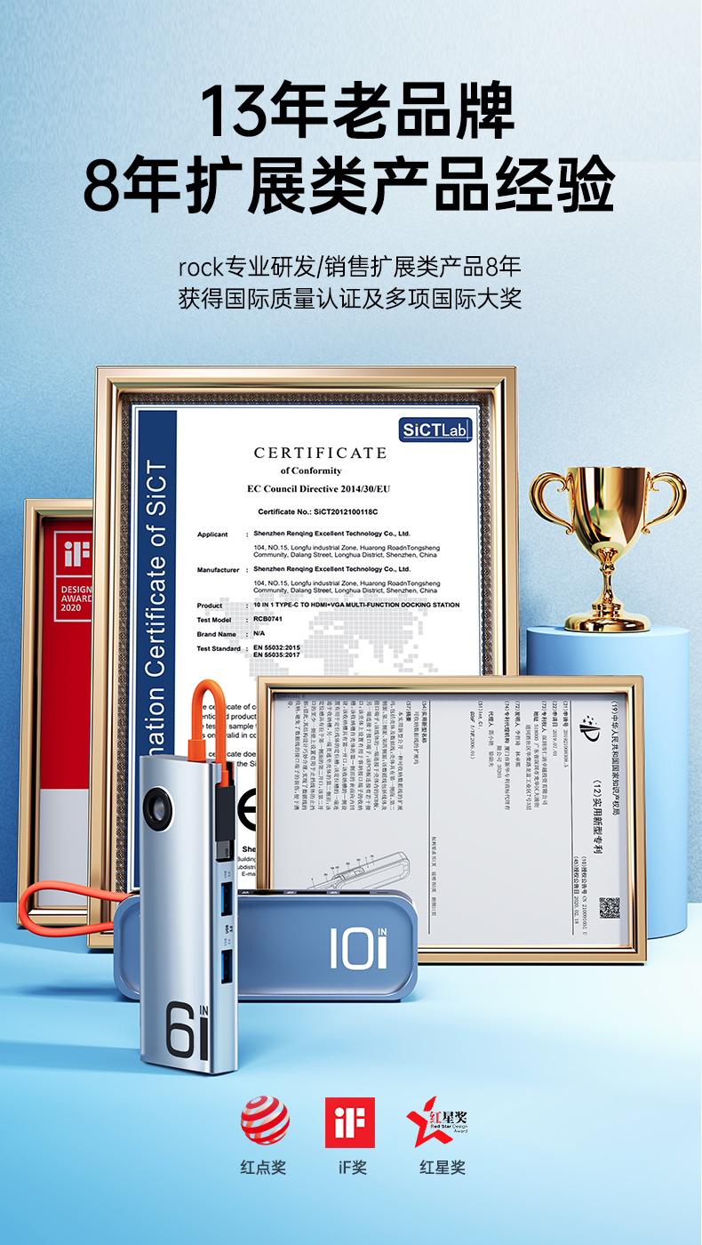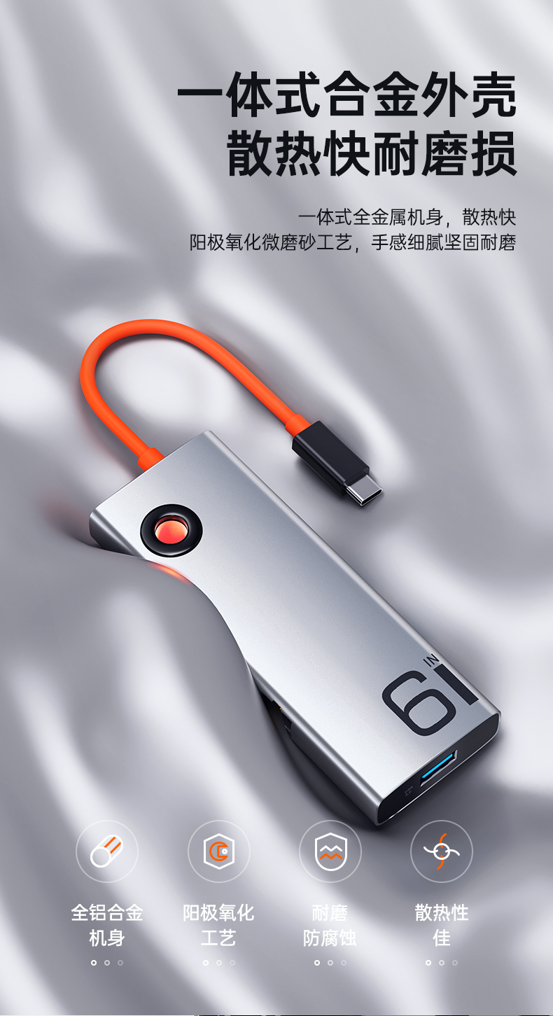 洛克(ROCK) TR32 TR28 HDMI(4K30Hz)+千兆网+PD快充+USB3.0*3 六合一扩展坞 RCB-0890(单位:个) 银色+黑色