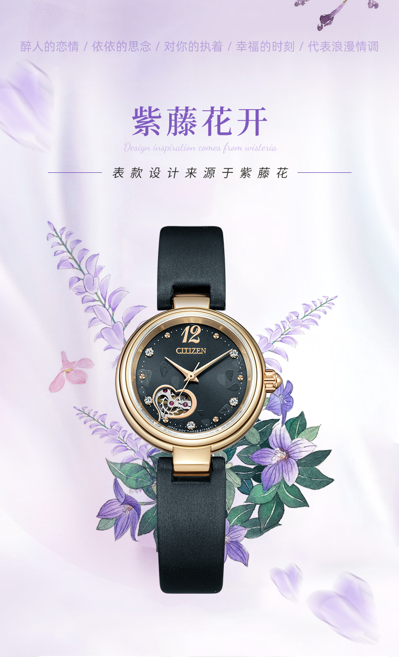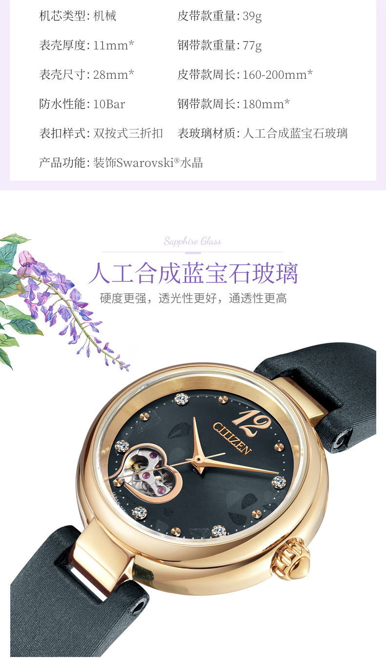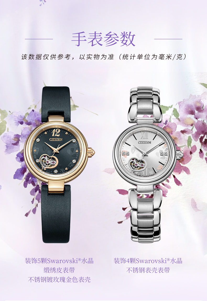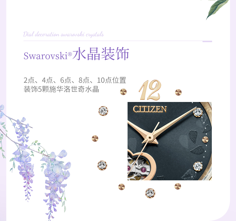 Citizen西铁城 自动机械紫藤花系列时尚柔美机械女表 PR1023-10H 灰蓝色