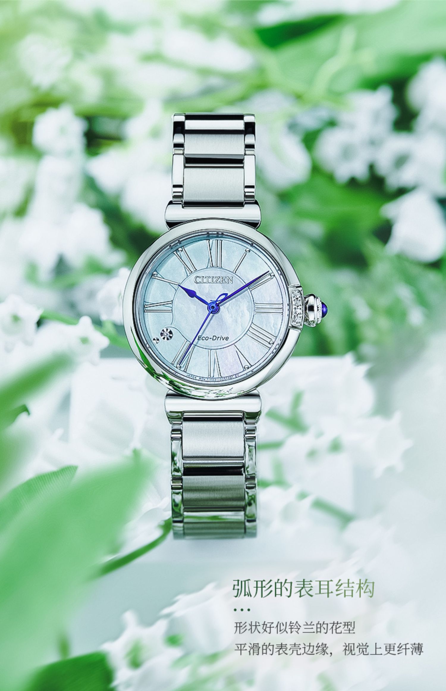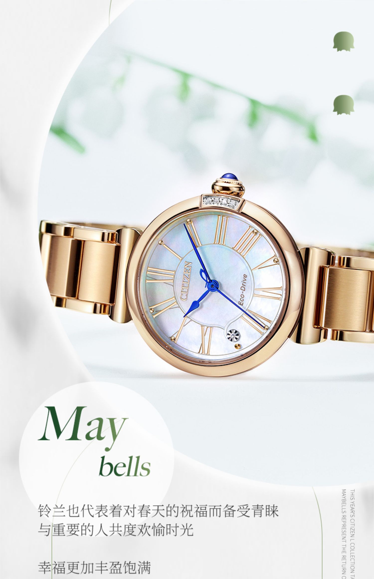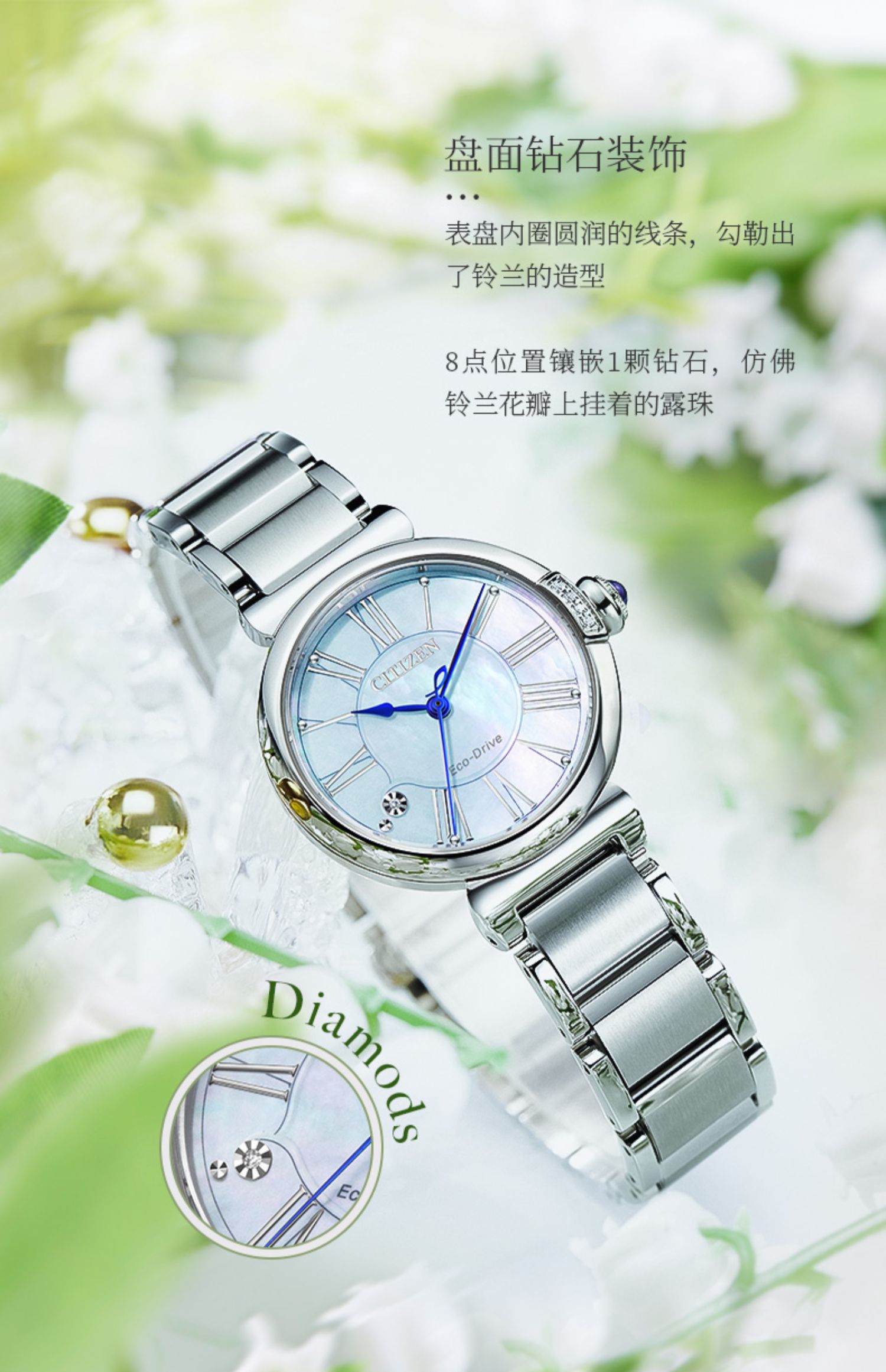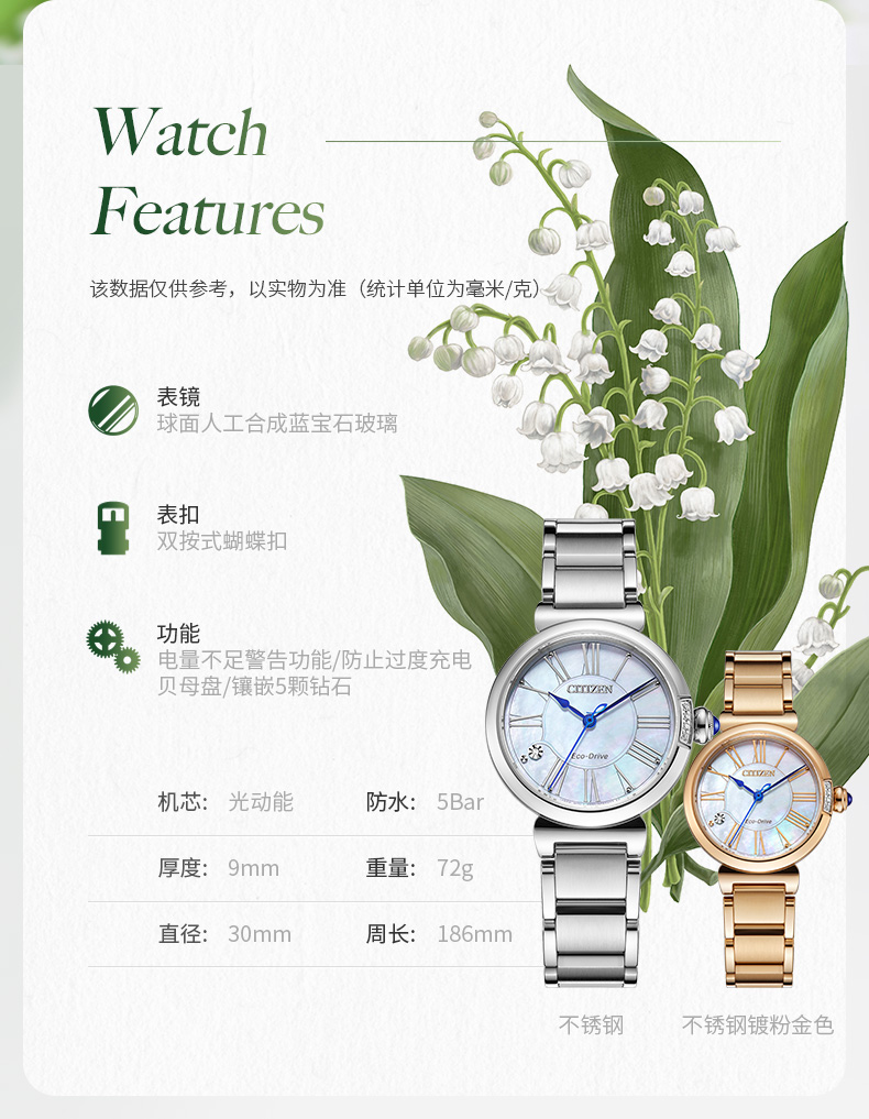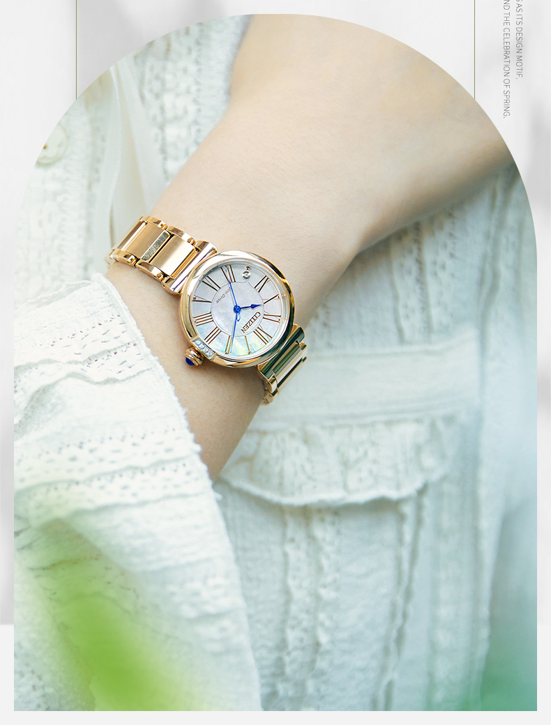 Citizen西铁城 花语风吟系列 光动能手表小铃花贝母盘优雅女表EM1063-89D 金色