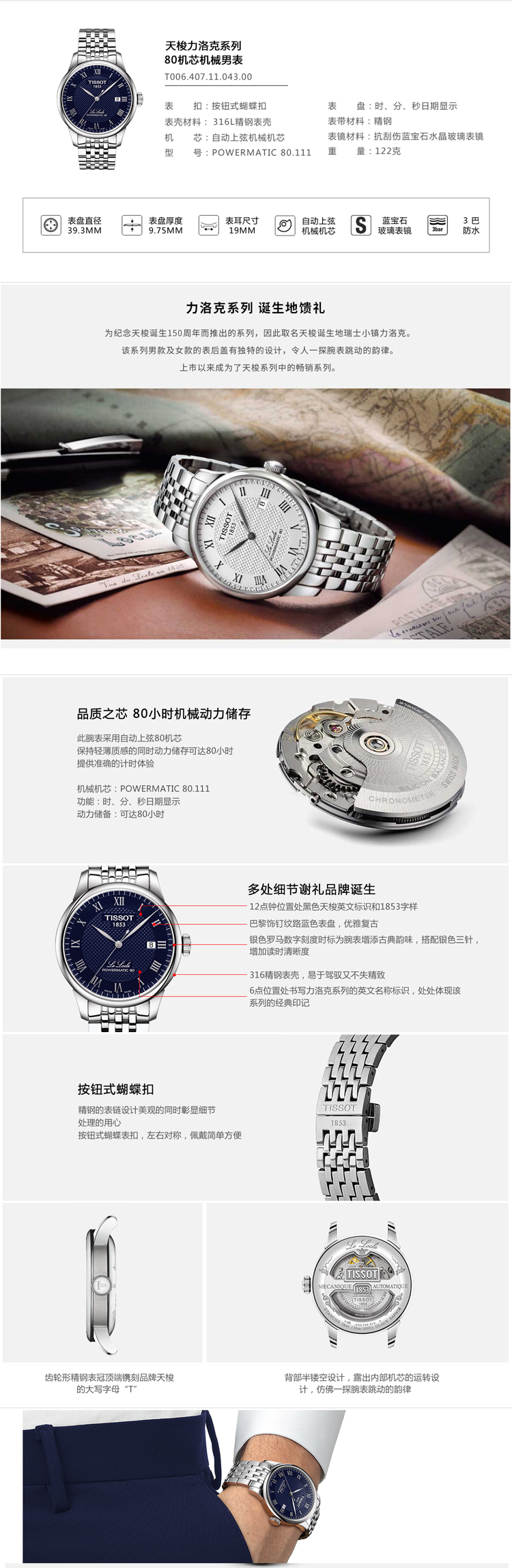天梭(TISSOT)瑞士手表 力洛克系列腕表 钢带机械男表T006.407.11.043.00 宝石蓝