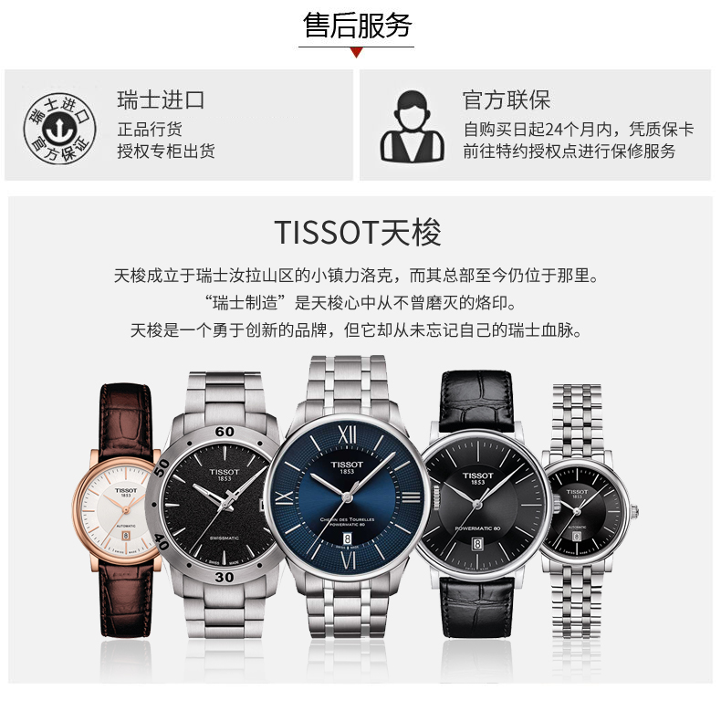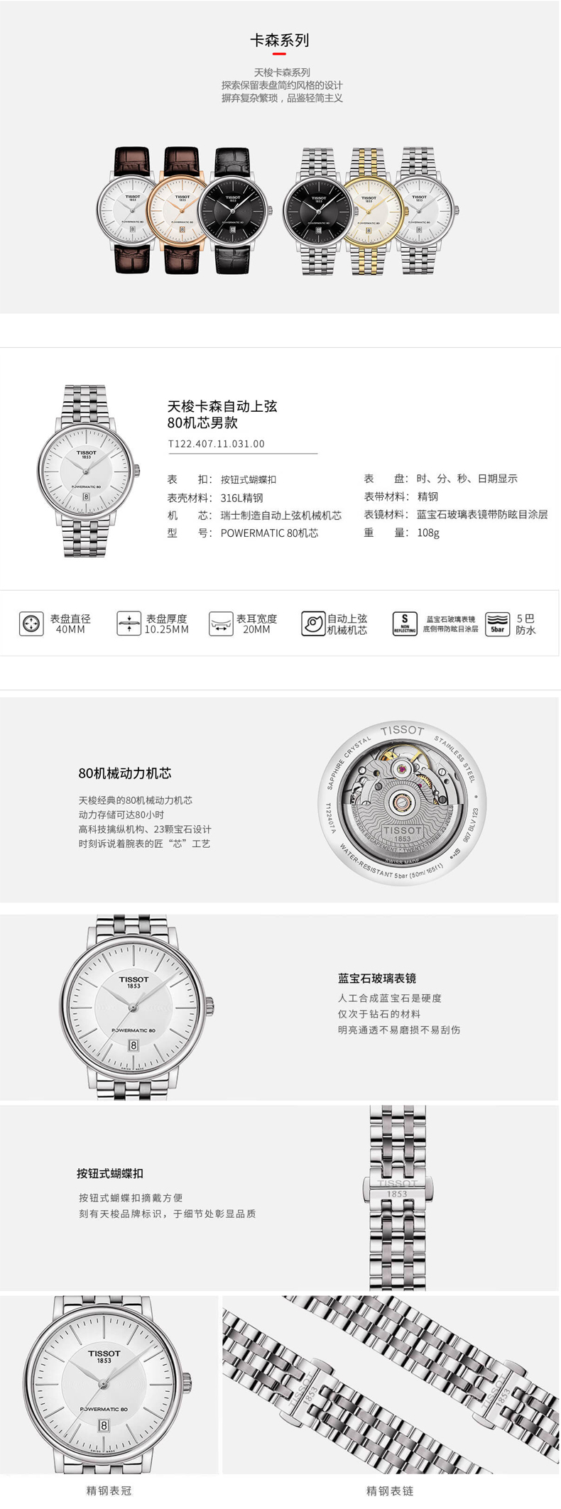 天梭(TISSOT)瑞士手表 卡森臻我系列腕表 钢带机械男表T122.407.11.031.00 白色