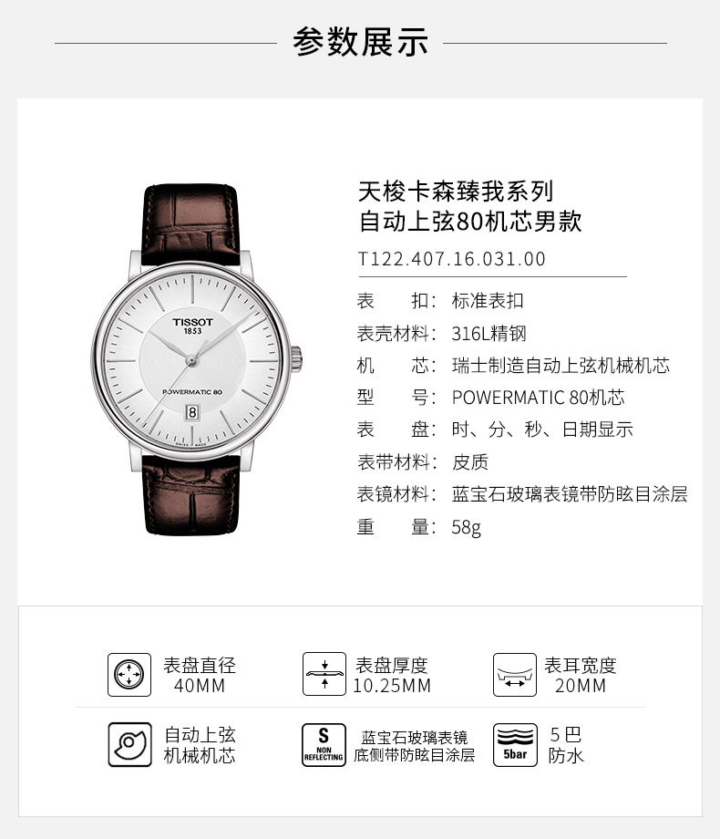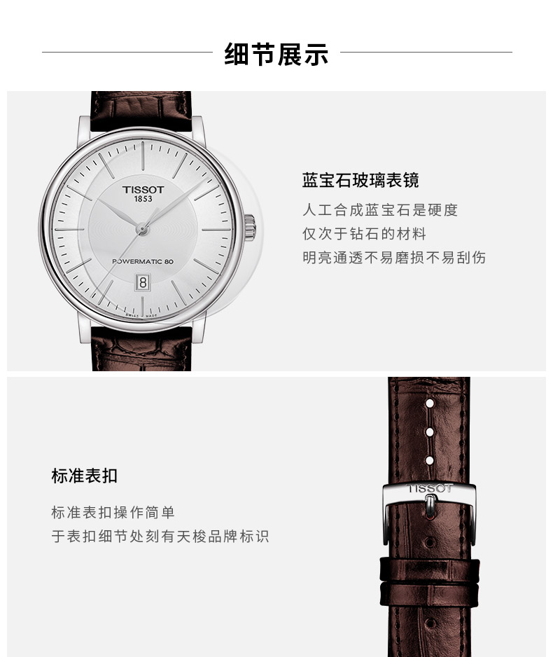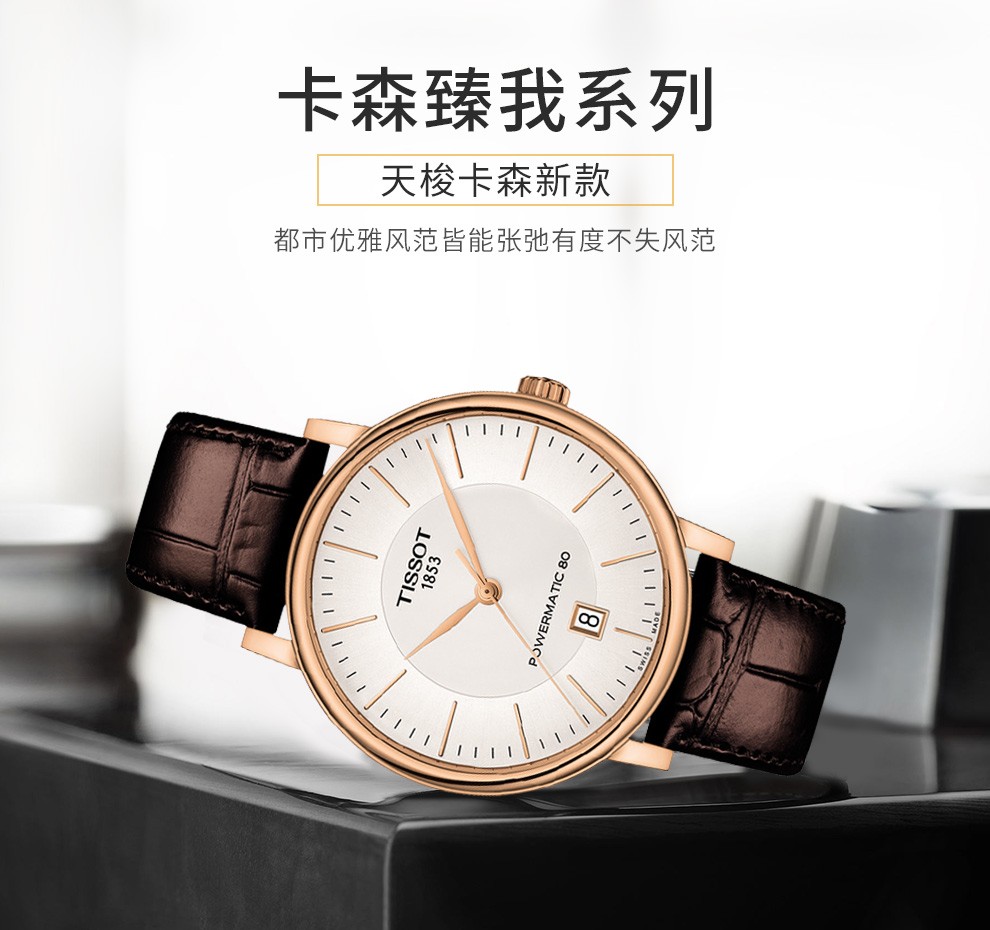 天梭(TISSOT)瑞士手表 卡森臻我系列腕表 皮带机械男表T122.407.16.031.00 白色