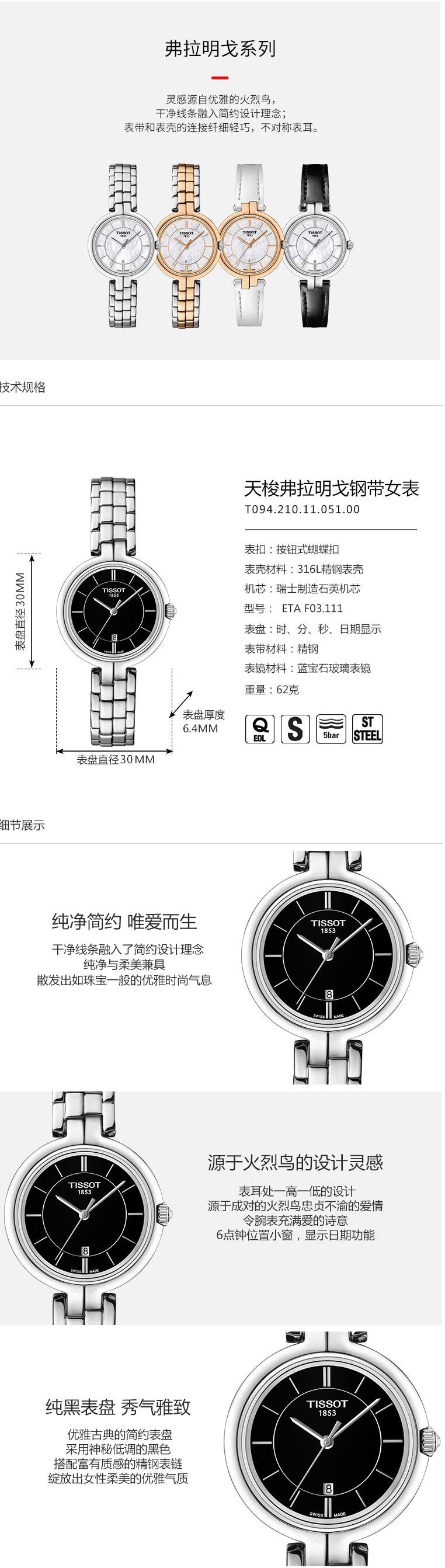 天梭(TISSOT)瑞士手表 弗拉明戈系列腕表 钢带石英女表T094.210.11.051.00 黑色