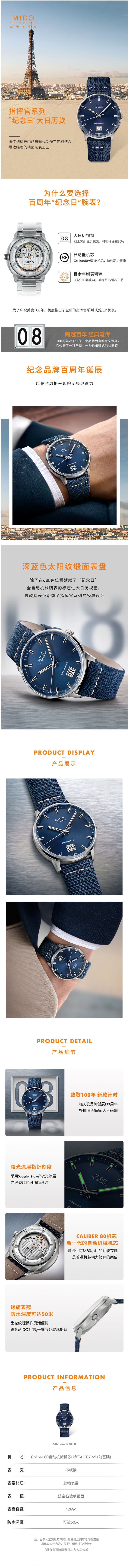 MIDO美度 指挥官系列“纪念日”大日历机械男士腕表 M021.626.17.041.00 单位:块 蓝色