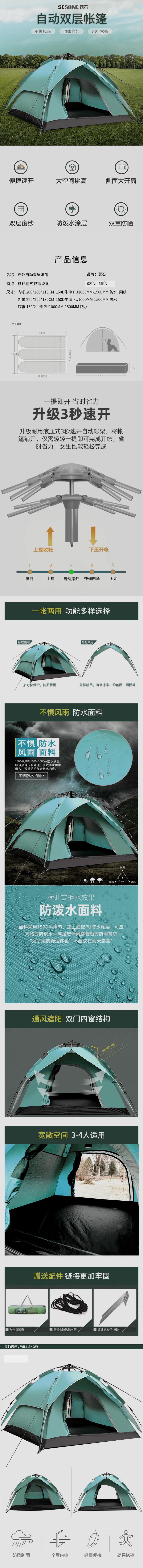 瑟石SESONE双层时尚A款 全自动帐篷 单位:顶 绿色