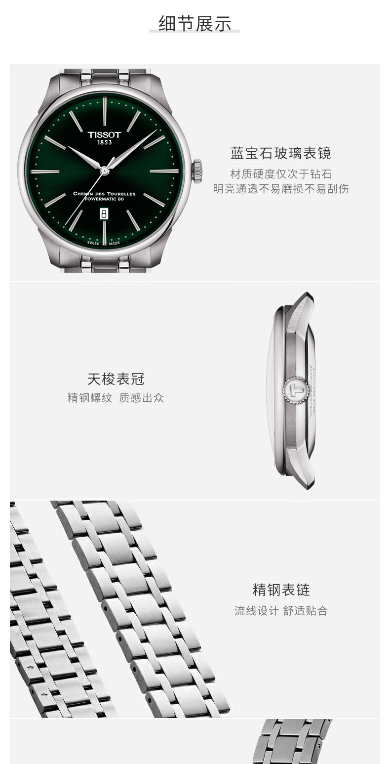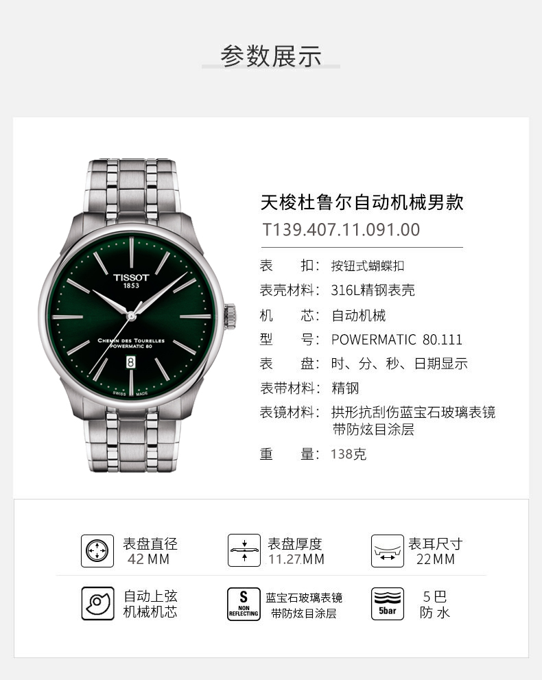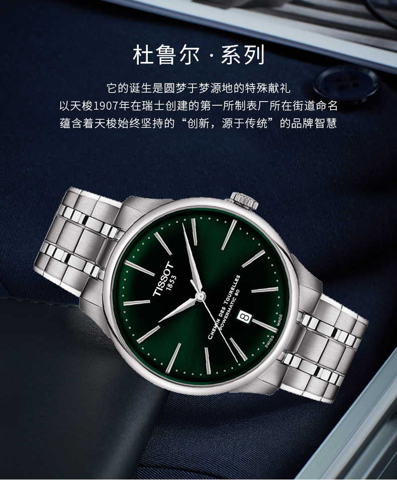 Tissot天梭 杜鲁尔系列钢带机械男士腕表 T139.407.11.091.00石英 (单位:块) 绿色