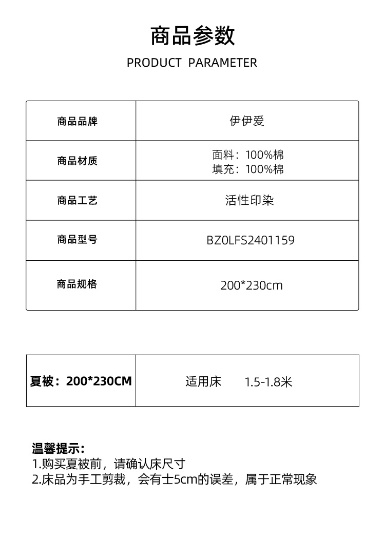 伊伊爱全棉印花棉花夏被200*230cm BZ0LFS2401159(条) 梦百合