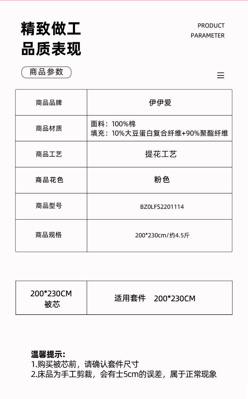 伊伊爱提花大豆春秋被200*230cm总重4.5斤 BZ0LFS2201114(条) 粉色