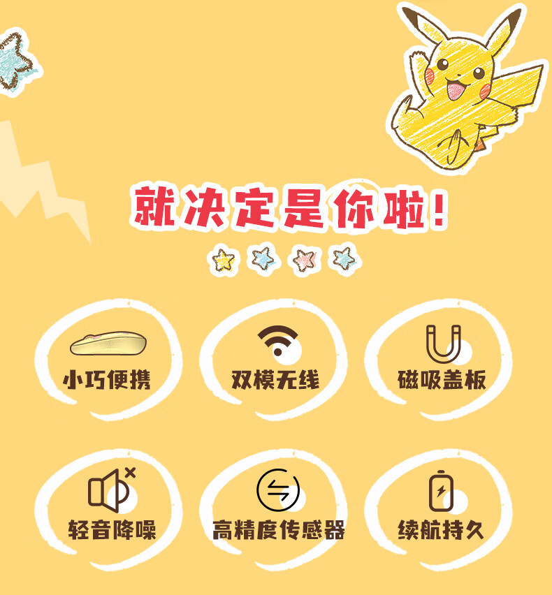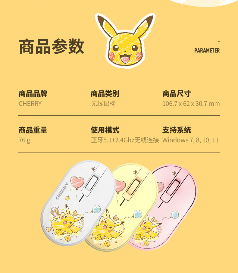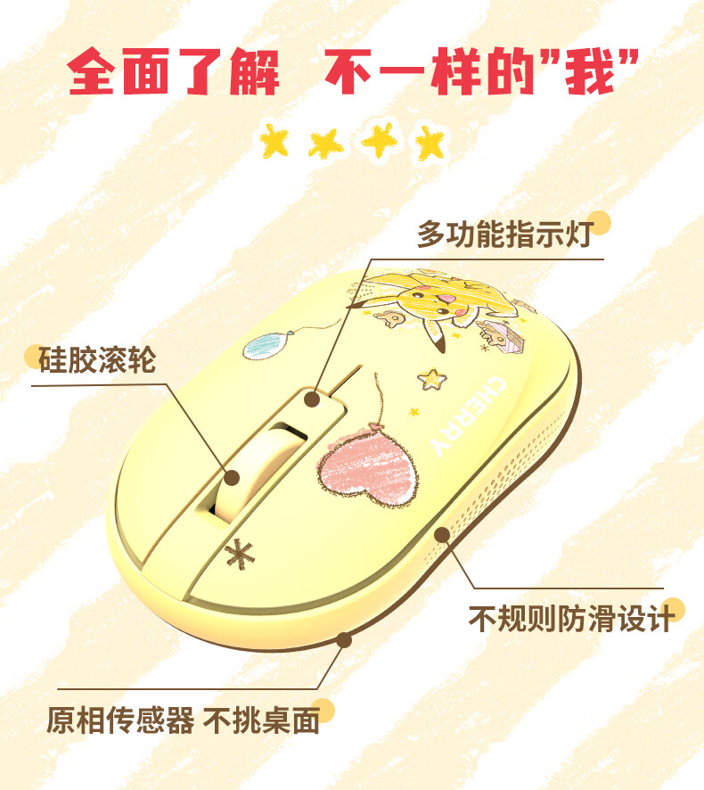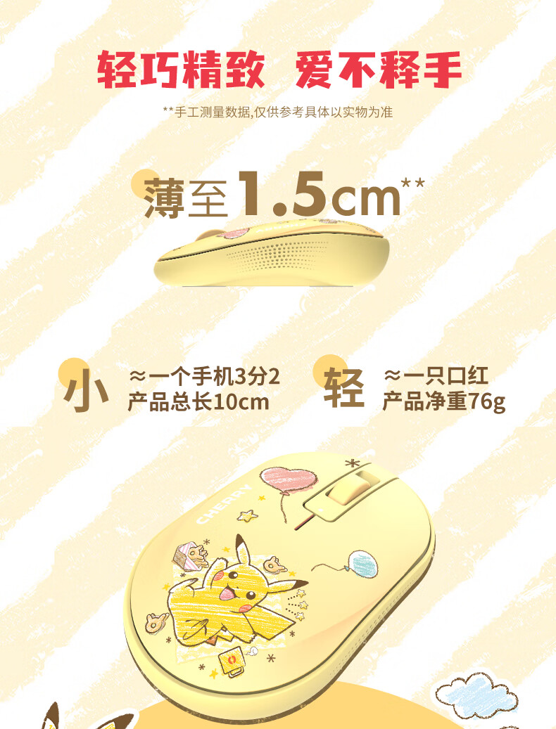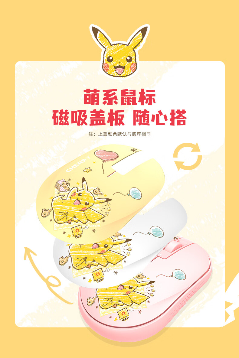 CHERRY樱桃 MW5180无线蓝牙鼠标 双模两用 轻音便携办公鼠标 皮卡丘 宝可梦版 单位:只 活力黄