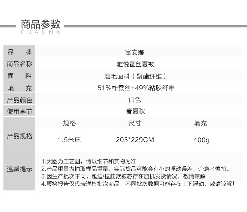 富安娜雅悦蚕丝被/203*229cm/400g(单位:床) 白色
