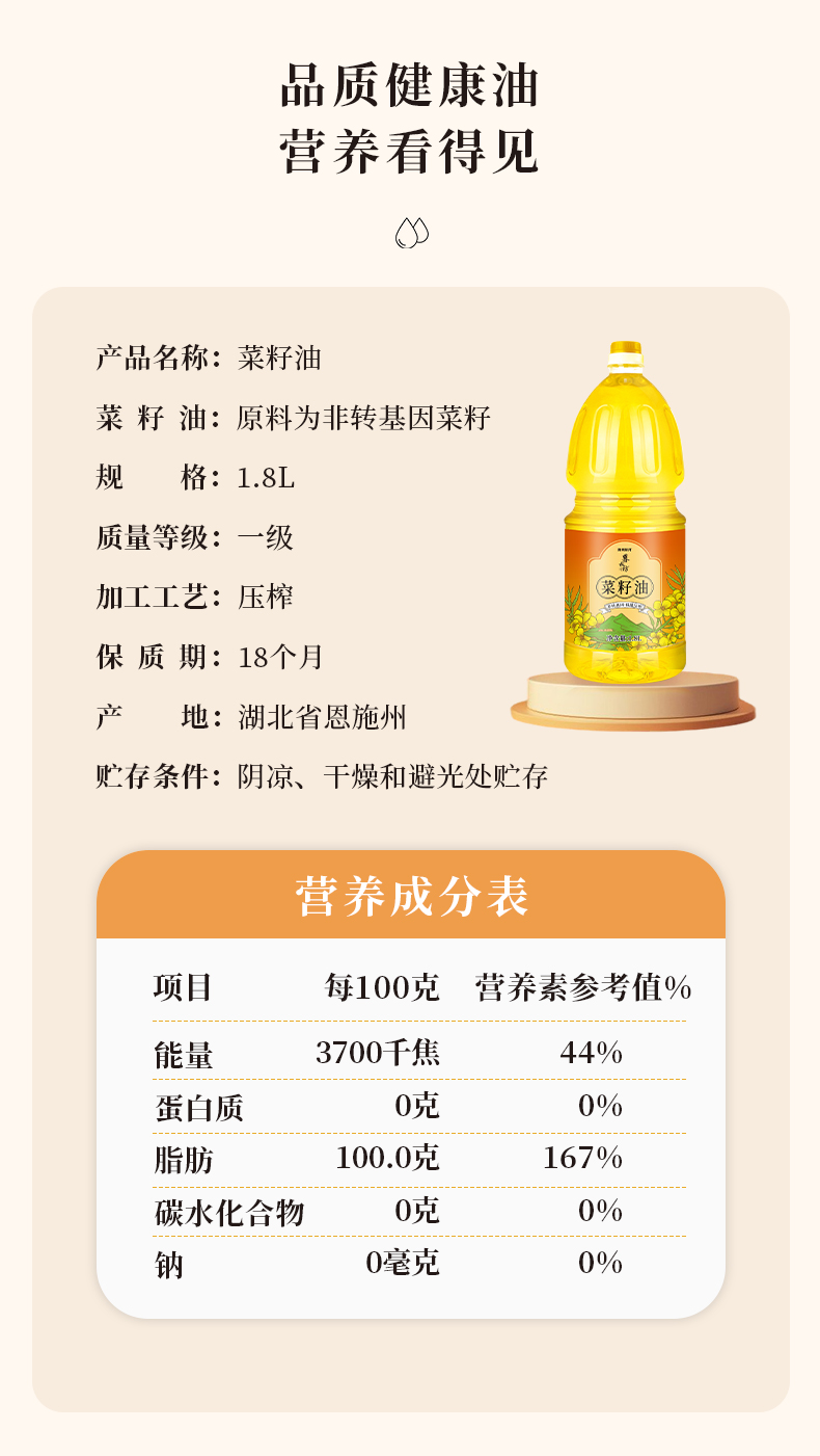 陇间柒月 一级菜籽油 月暮秋坊 1.8L*1 黄色(单位:瓶)