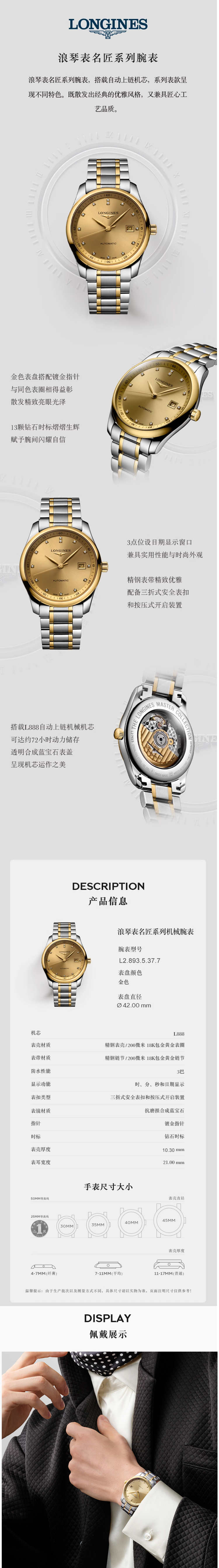 浪琴Longines 名匠系列机械手表男表 L2.893.5.37.7(单位1块) 金色