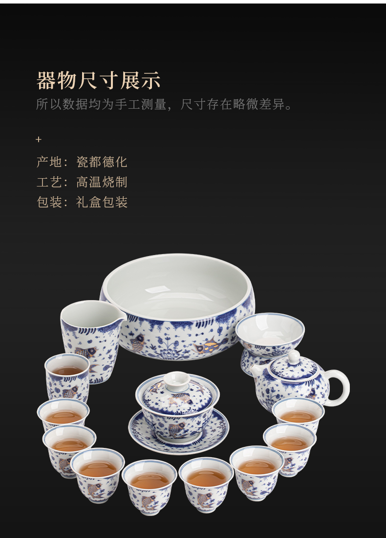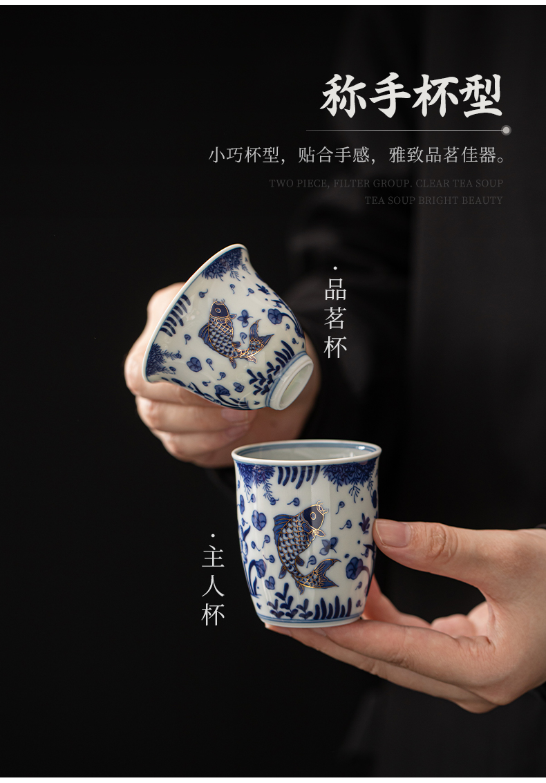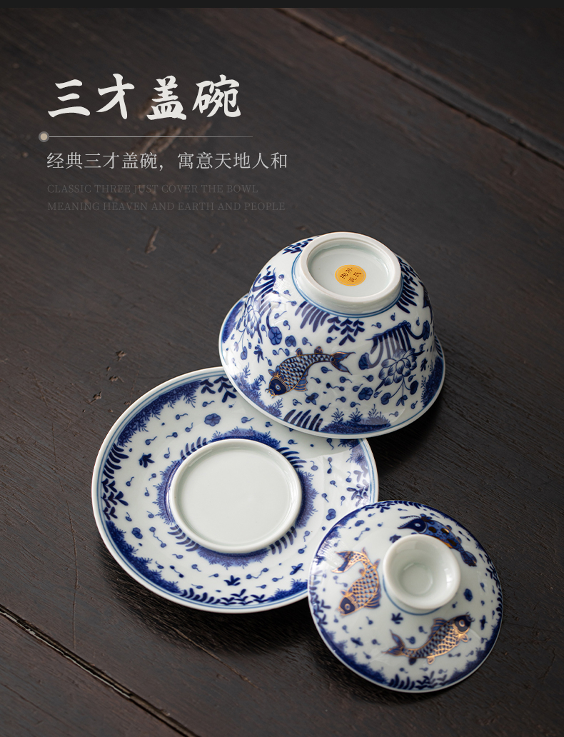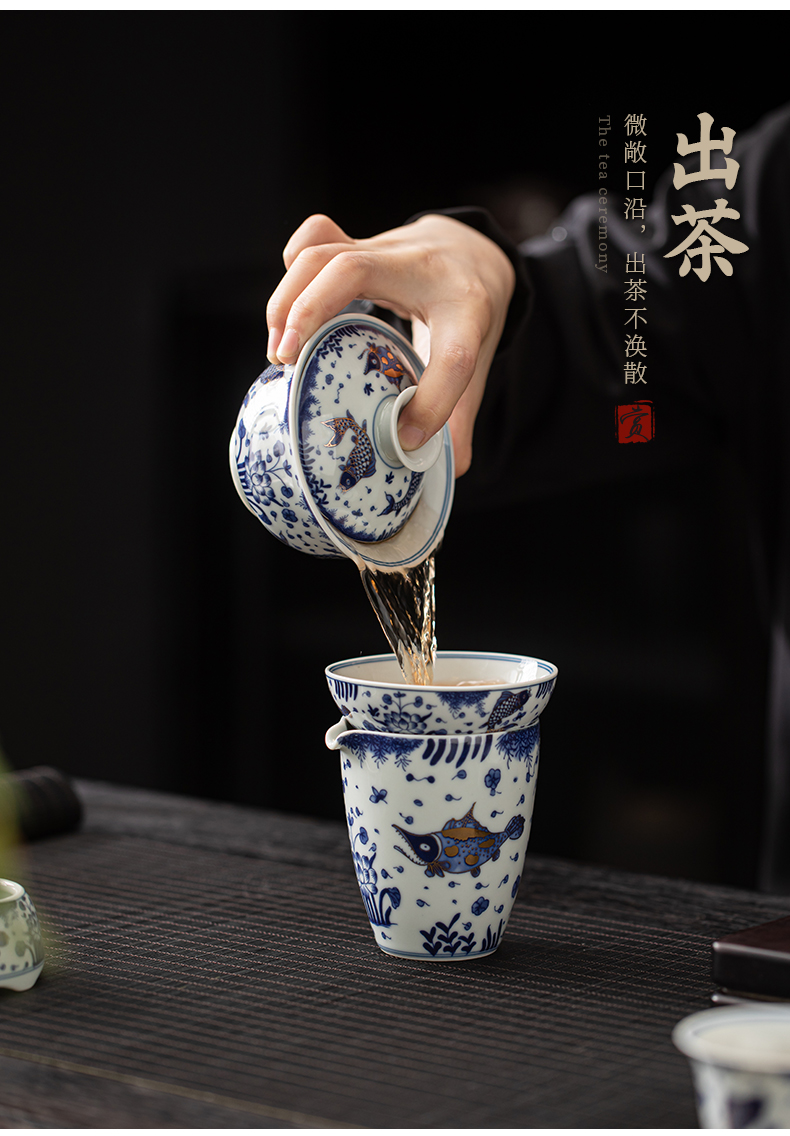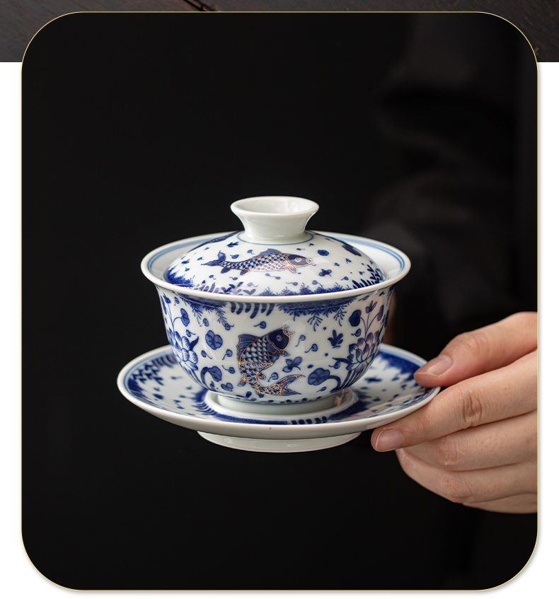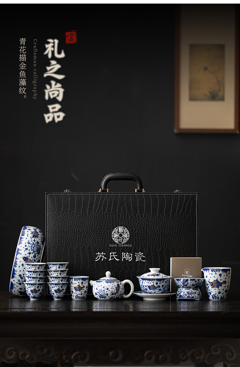 苏氏陶瓷(SUSHI CERAMICJS) 1071柴窑青花描金鱼藻纹非遗大师苏爱珍作品(单位:套) 白色