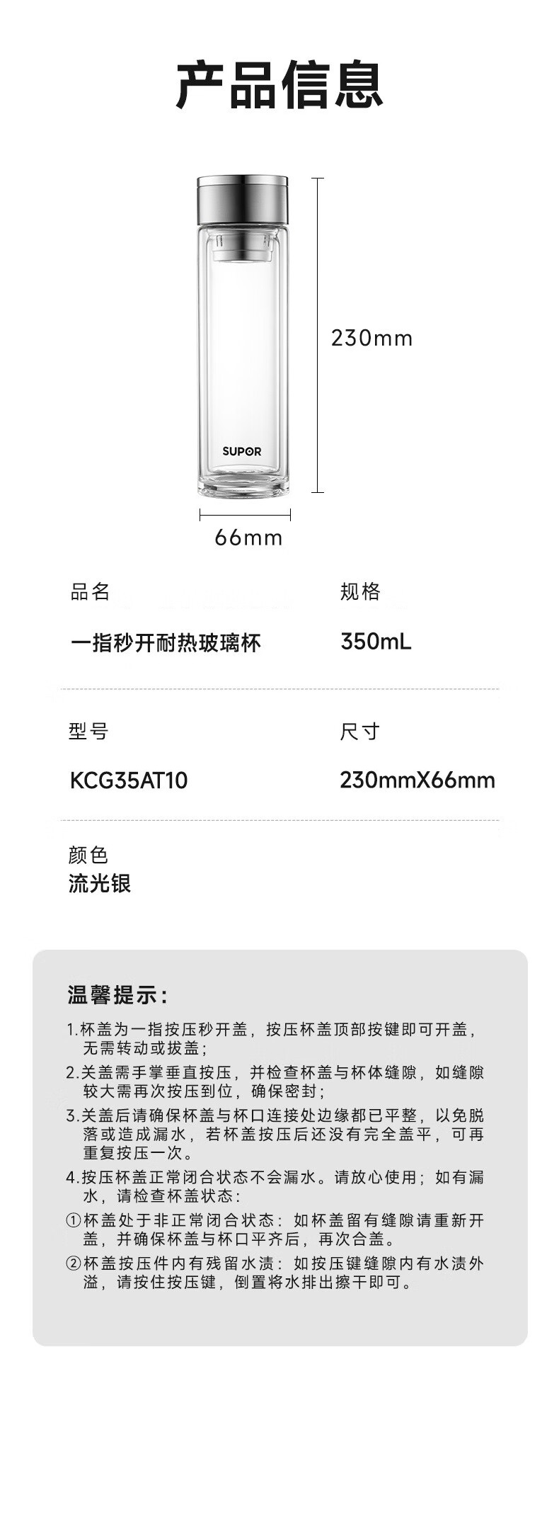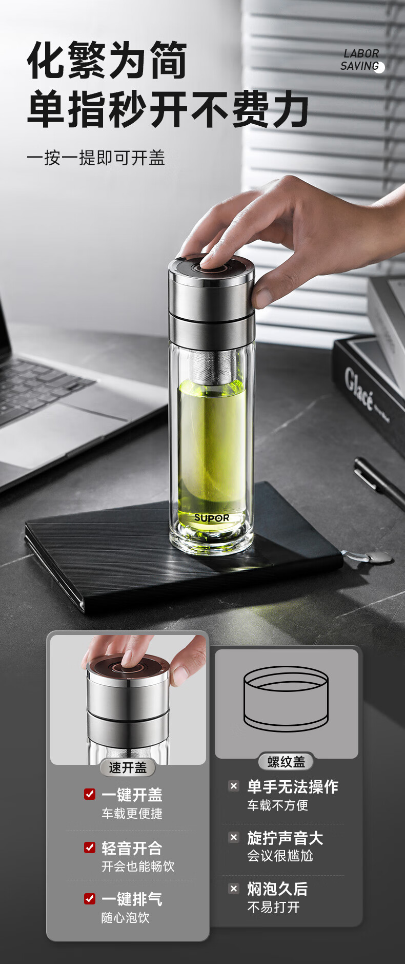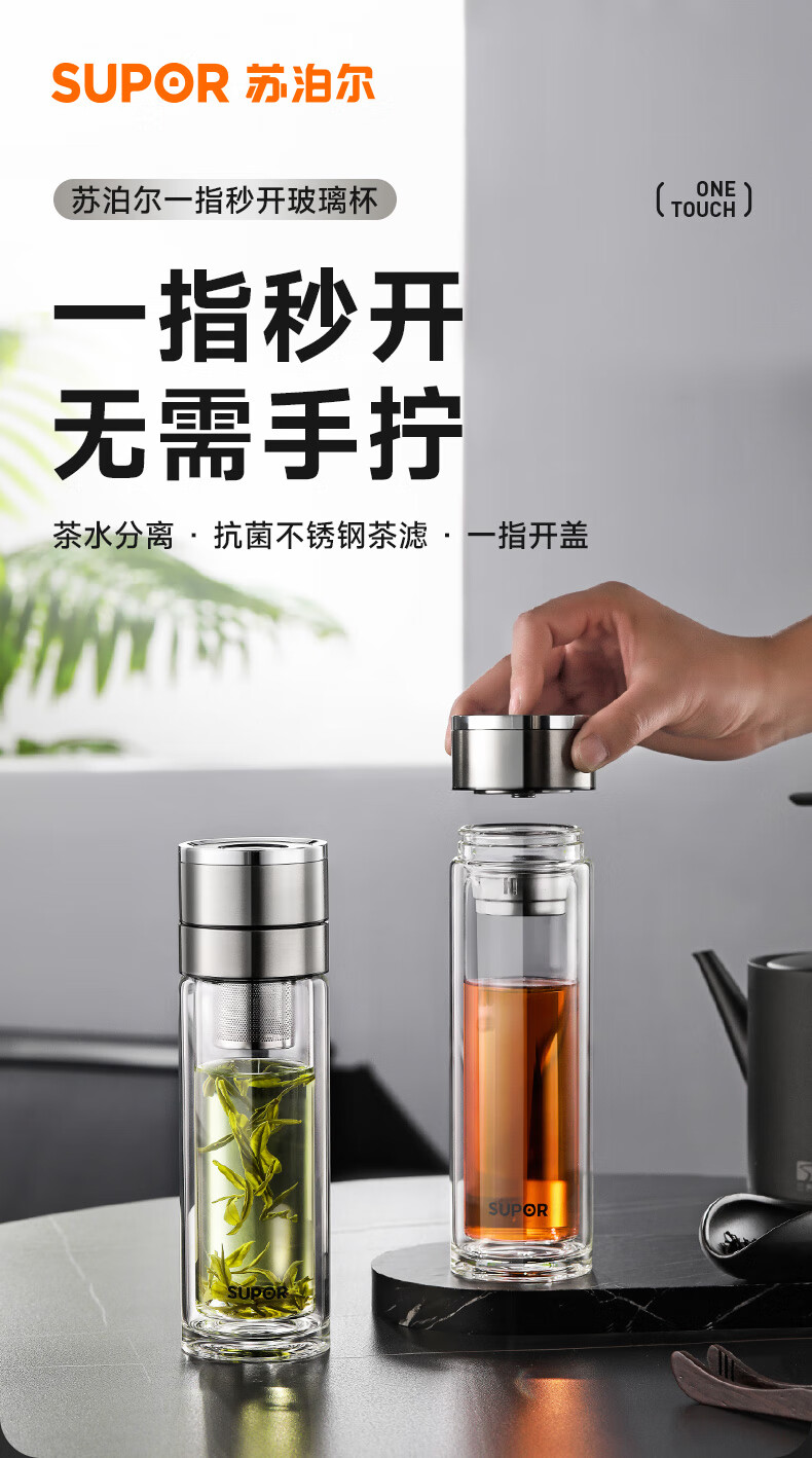 苏泊尔(SUPOR)350ml一键开盖茶水分离玻璃杯【茶滤款】KCG35AT10/个 流光银