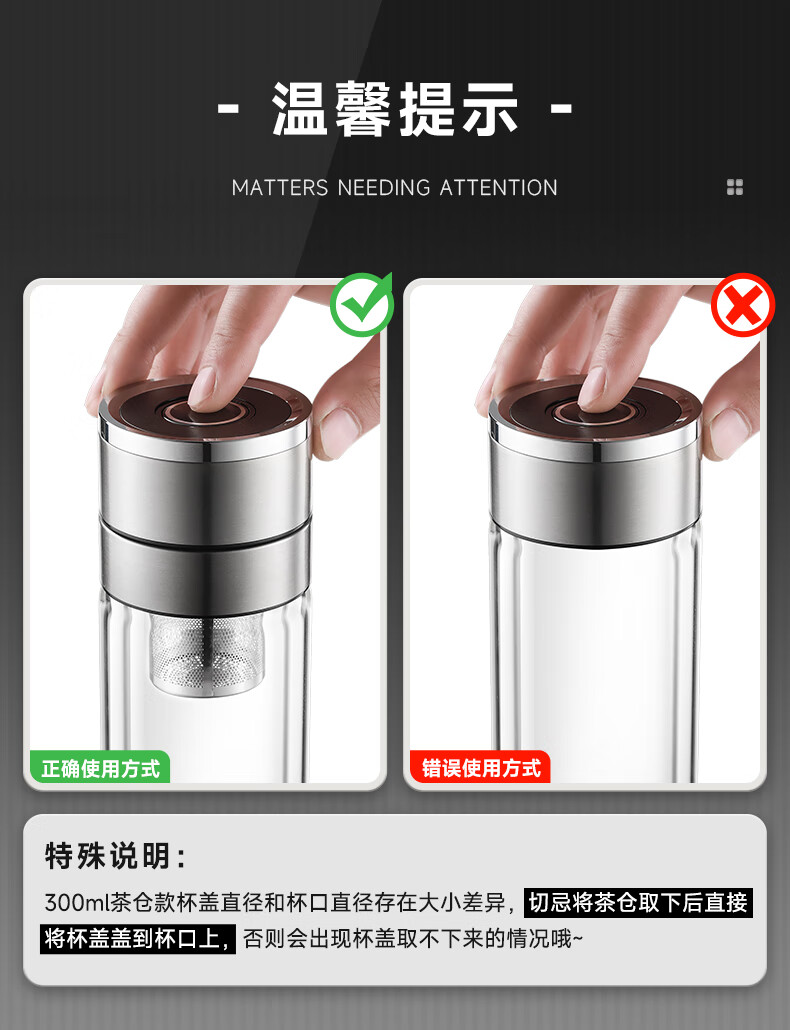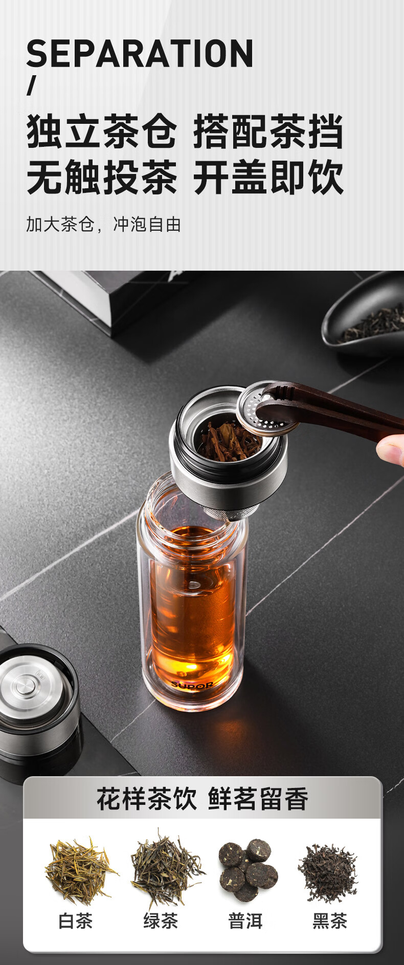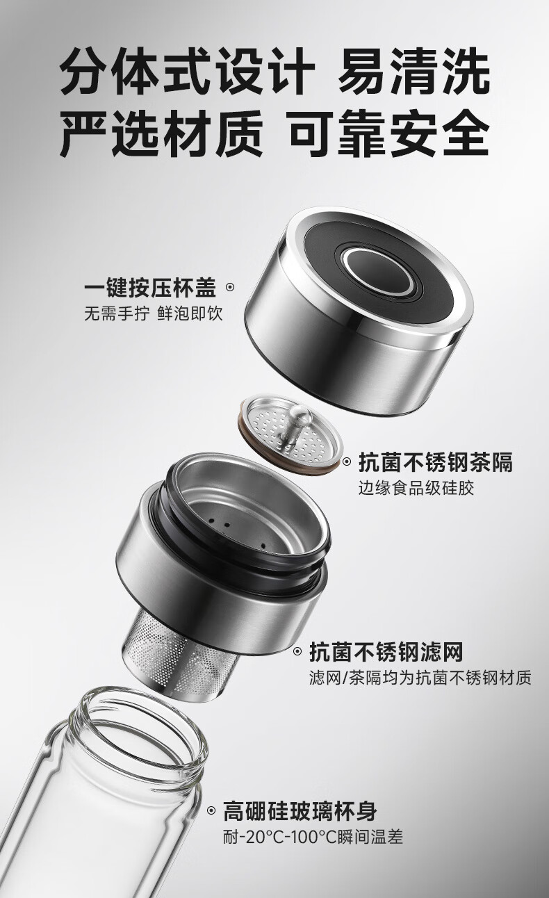 苏泊尔(SUPOR)350ml一键开盖茶水分离玻璃杯【茶滤款】KCG35AT10/个 流光银