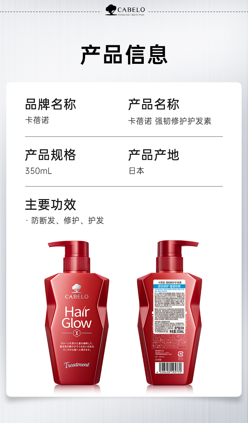 卡蓓诺/CABELO 强韧防断 损伤修护 护发素 350ml 红色(单位:瓶)