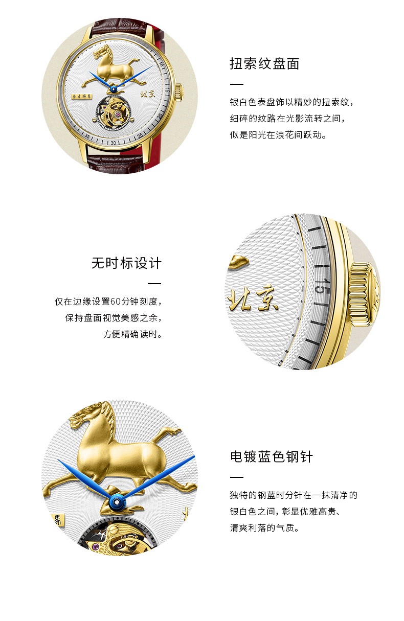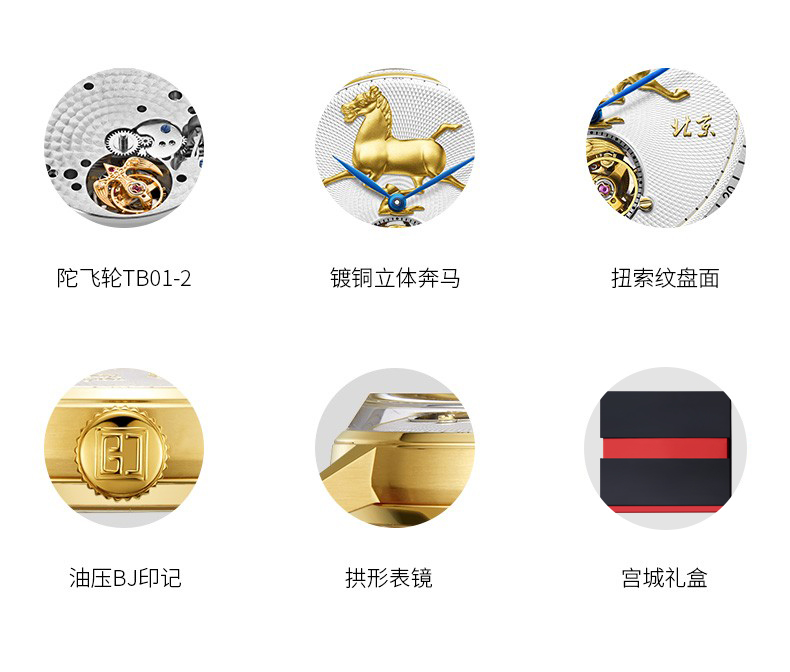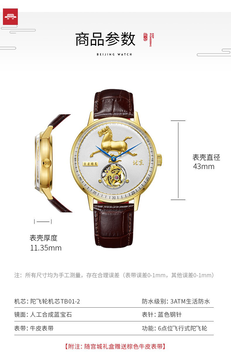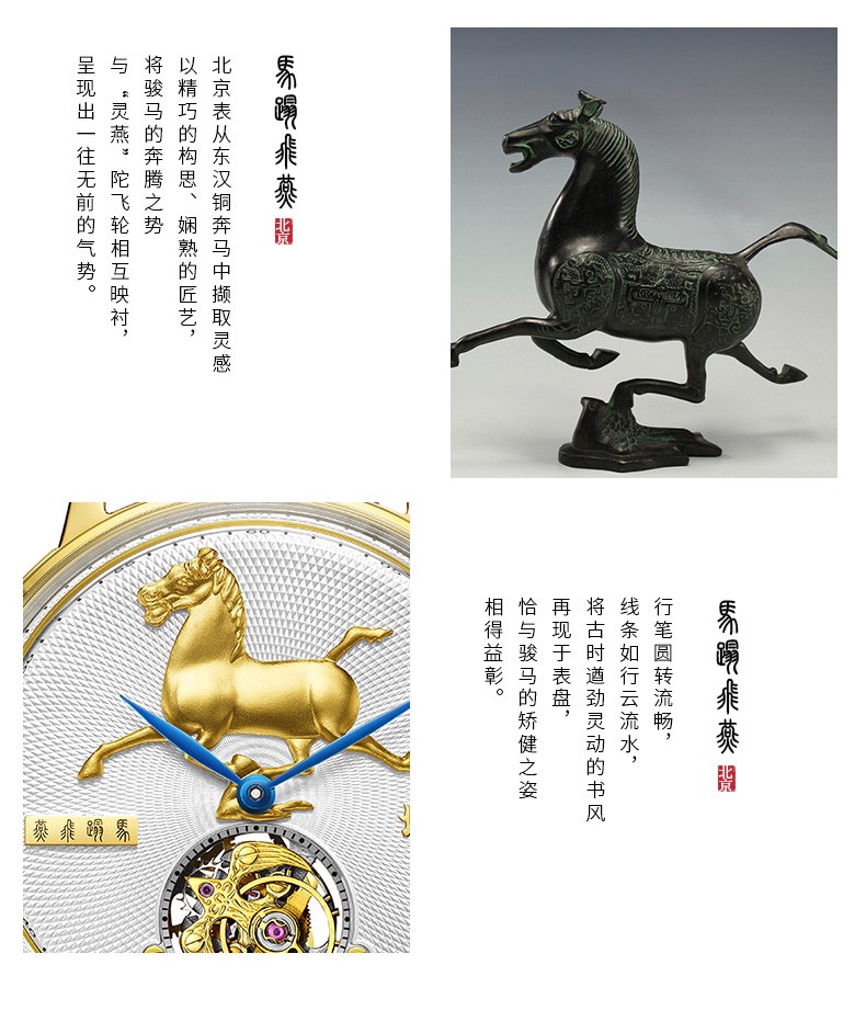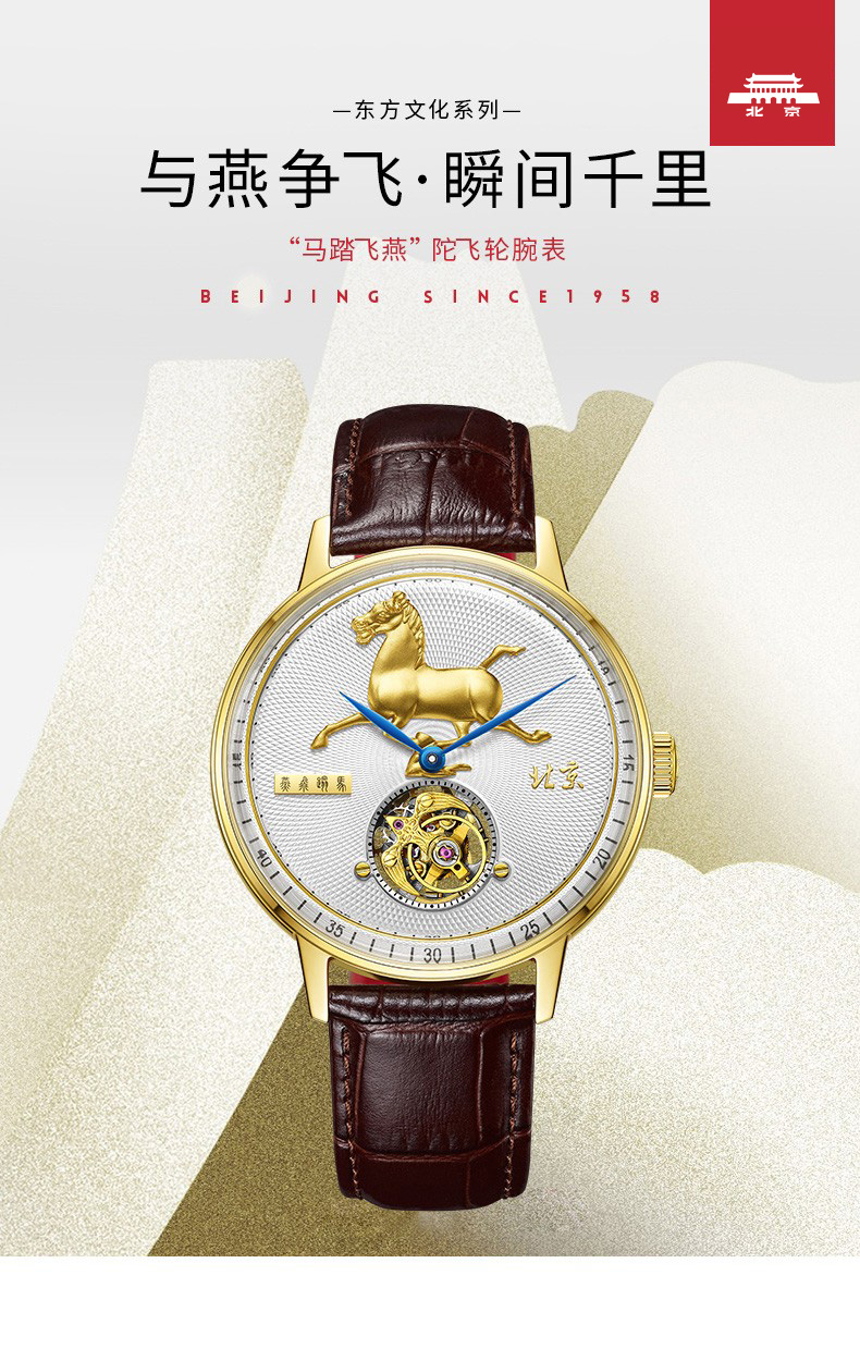 北京手表马踏飞燕陀飞轮手动机械手表男防水高端国表名表礼物男士腕表 踏马飞燕-BG950501/只 金色