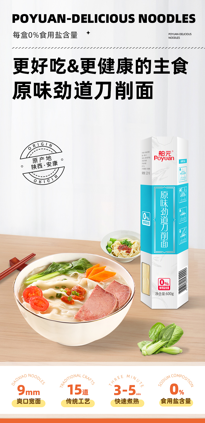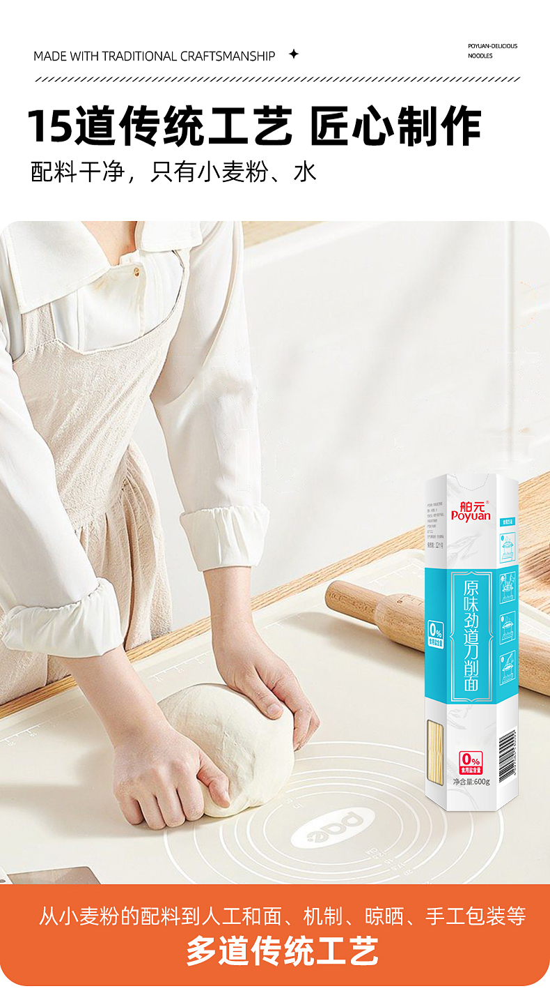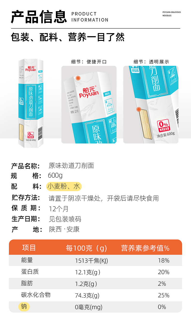 舶元(Poyuan)陕西宽面条挂面陕味刀削面杂粮面油泼面烩面0盐原味 原味劲道刀削面600g*3 盒 水蓝色