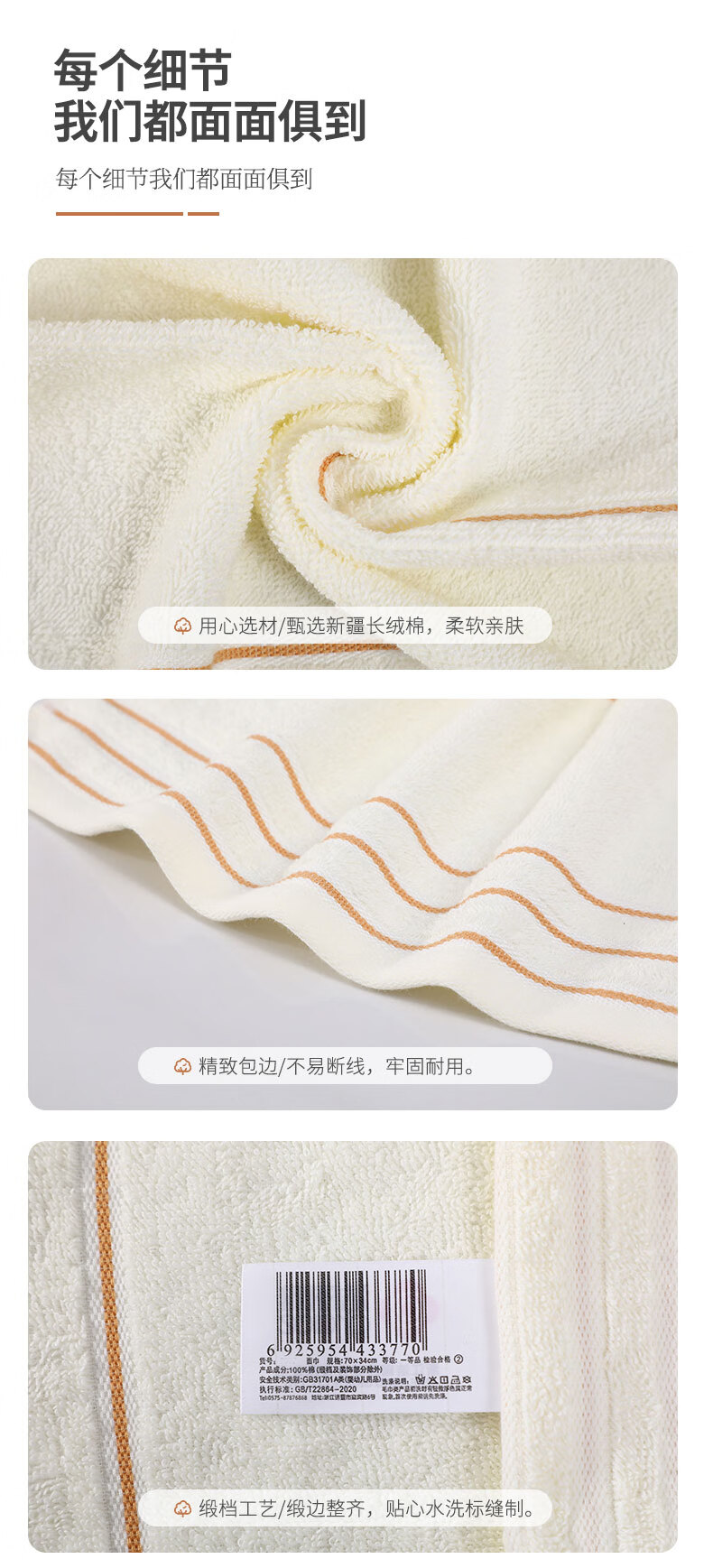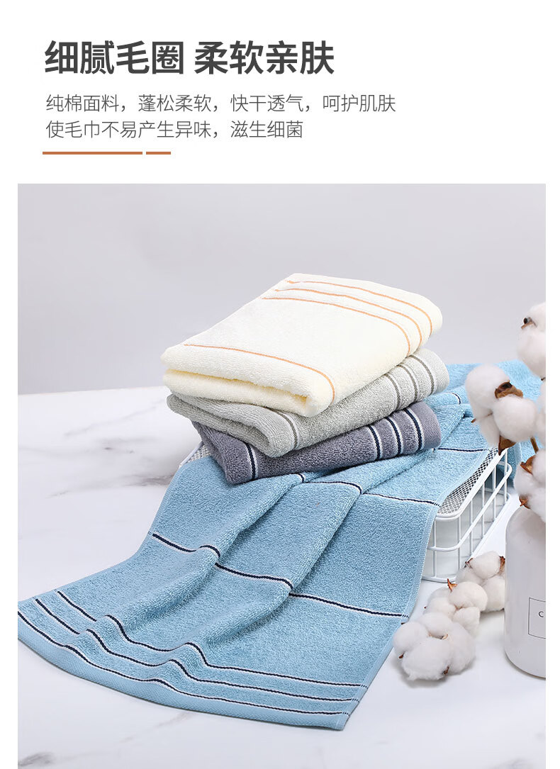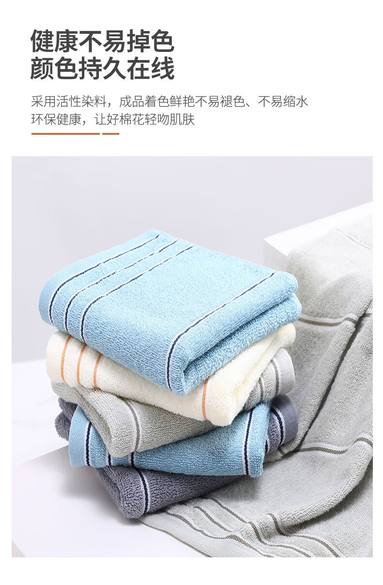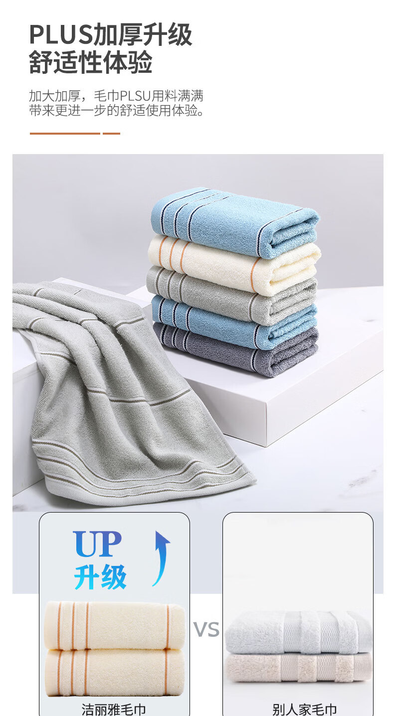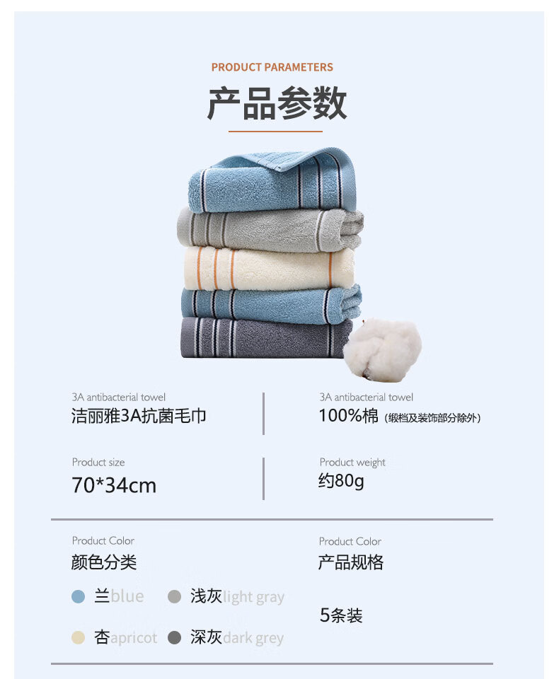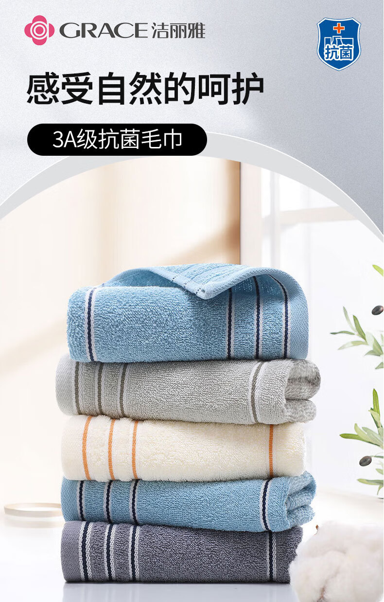 洁丽雅Grace A类纯棉抗菌毛巾新疆长绒棉A类5条装家用成人洗脸巾 7377