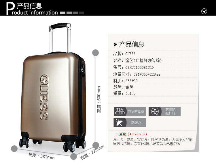 GUESS LINN 金色登机箱 GSXU6105981GLD (单位:个) 金色 20寸