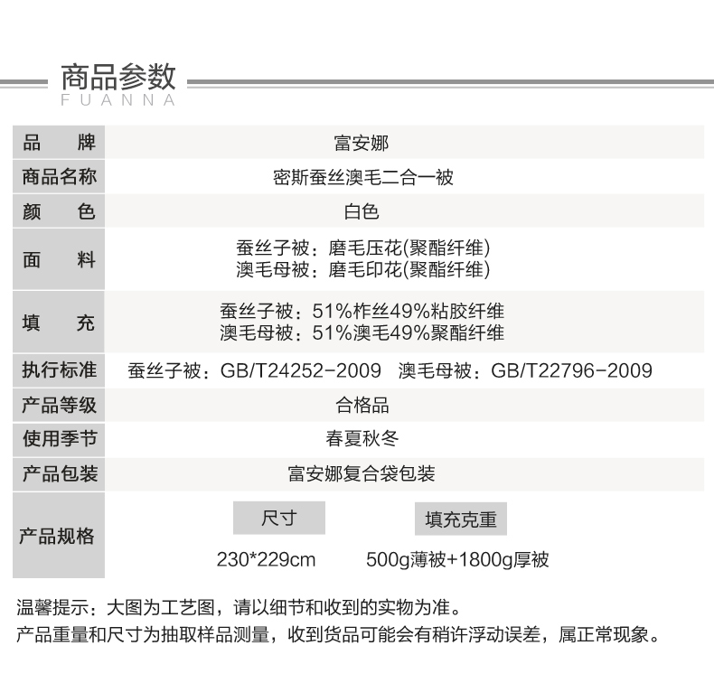 富安娜密斯蚕丝澳毛二合一被/套 白色203*229CM