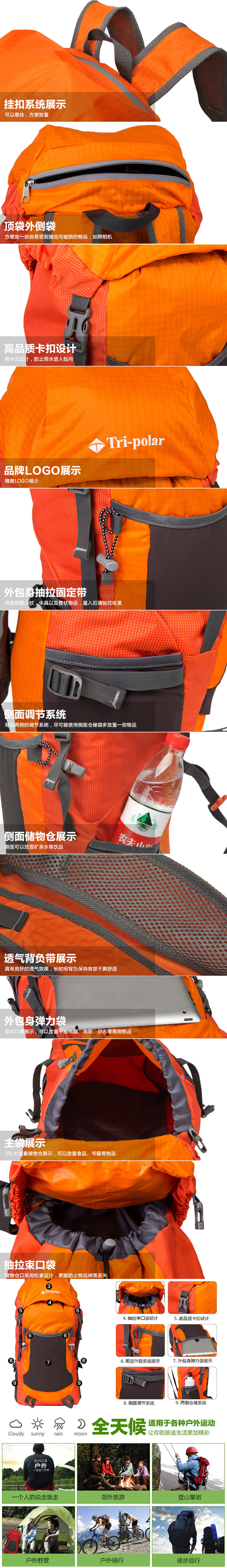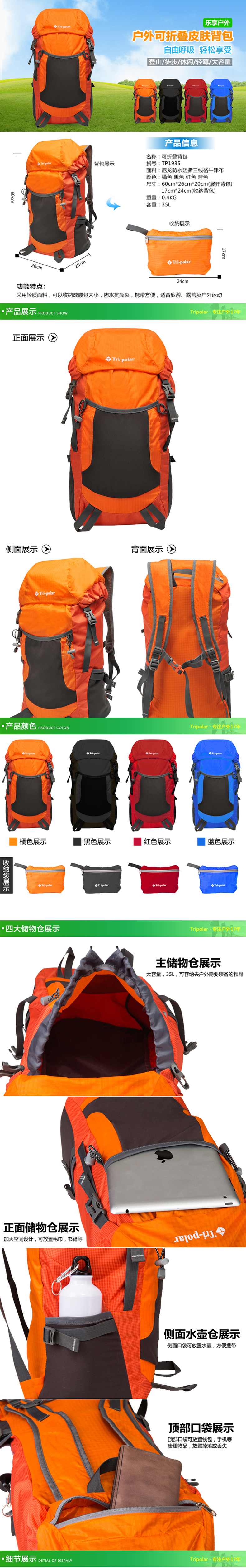 三极 TP1935 户外旅行大容量35L可折叠双肩包 26*20*60cm 个 橘色