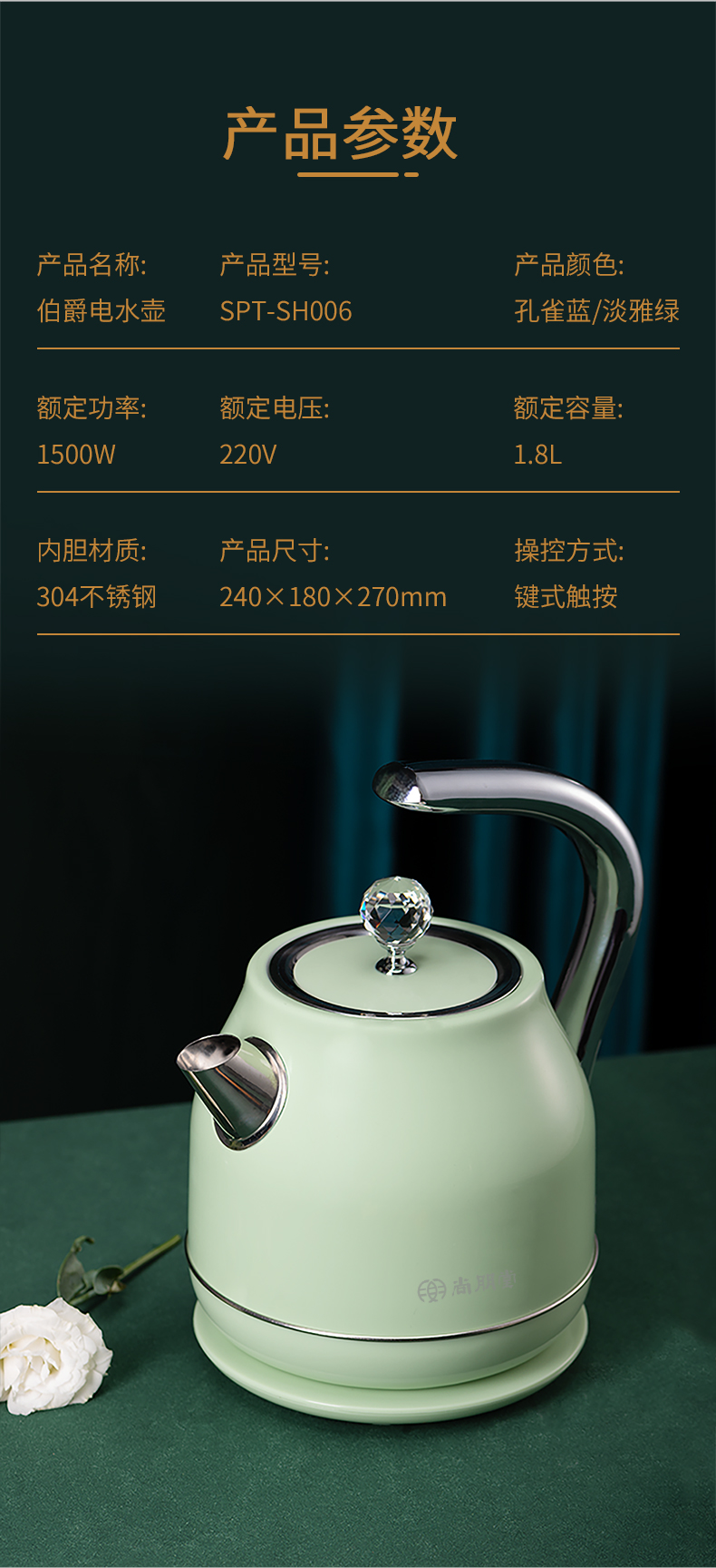 尚朋堂 1.8L伯爵电水壶SPT-SH006/台 蓝色