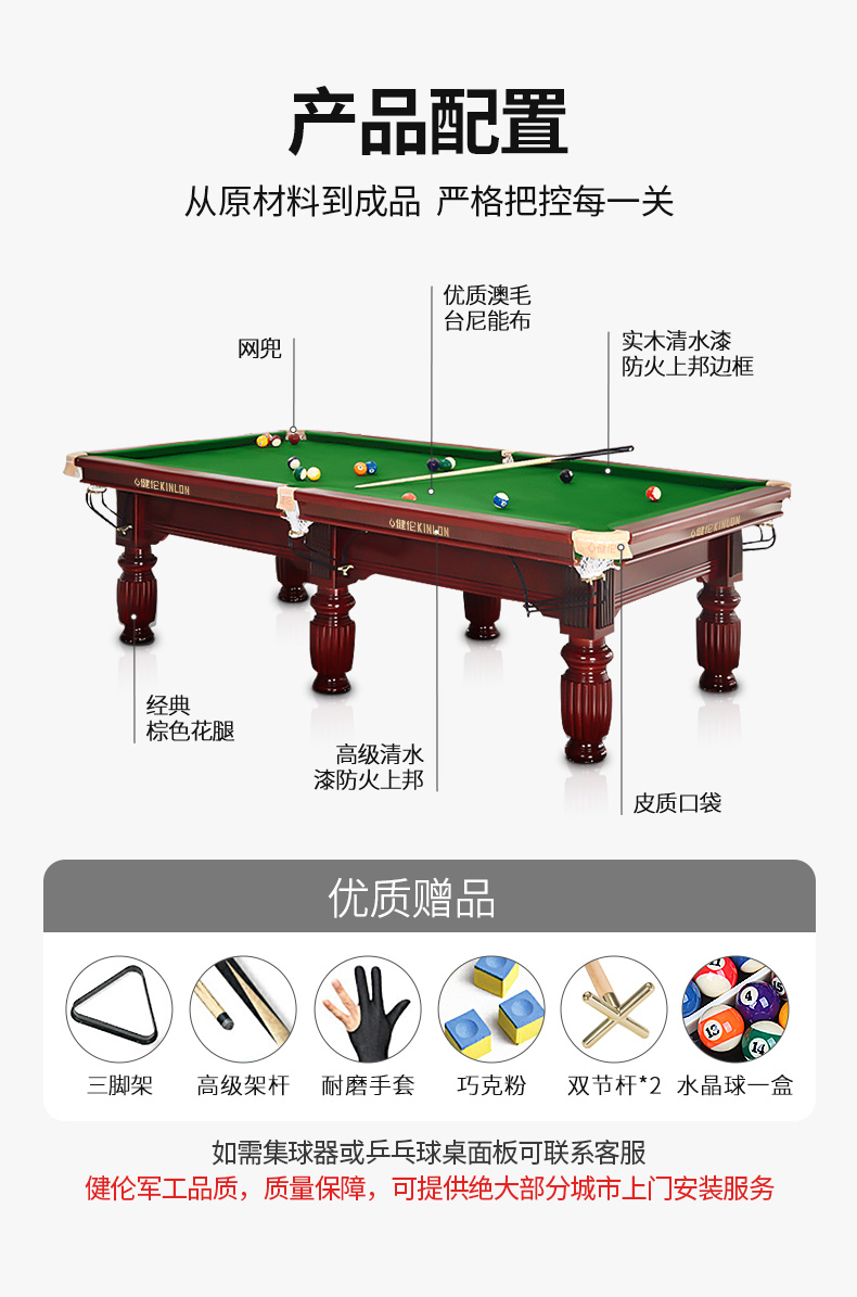 健伦(JEEANLEAN)JL-ZQT36台球桌成人桌球台家用黑八美式中式经典黑八 高配版 军绿色
