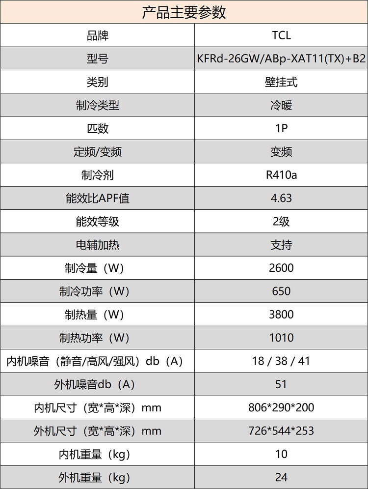 TCL空调 KFRd-26GW/ABp-XAT11(TX)+B2 冷暖单相1匹变频壁挂式空调单位:套 白色