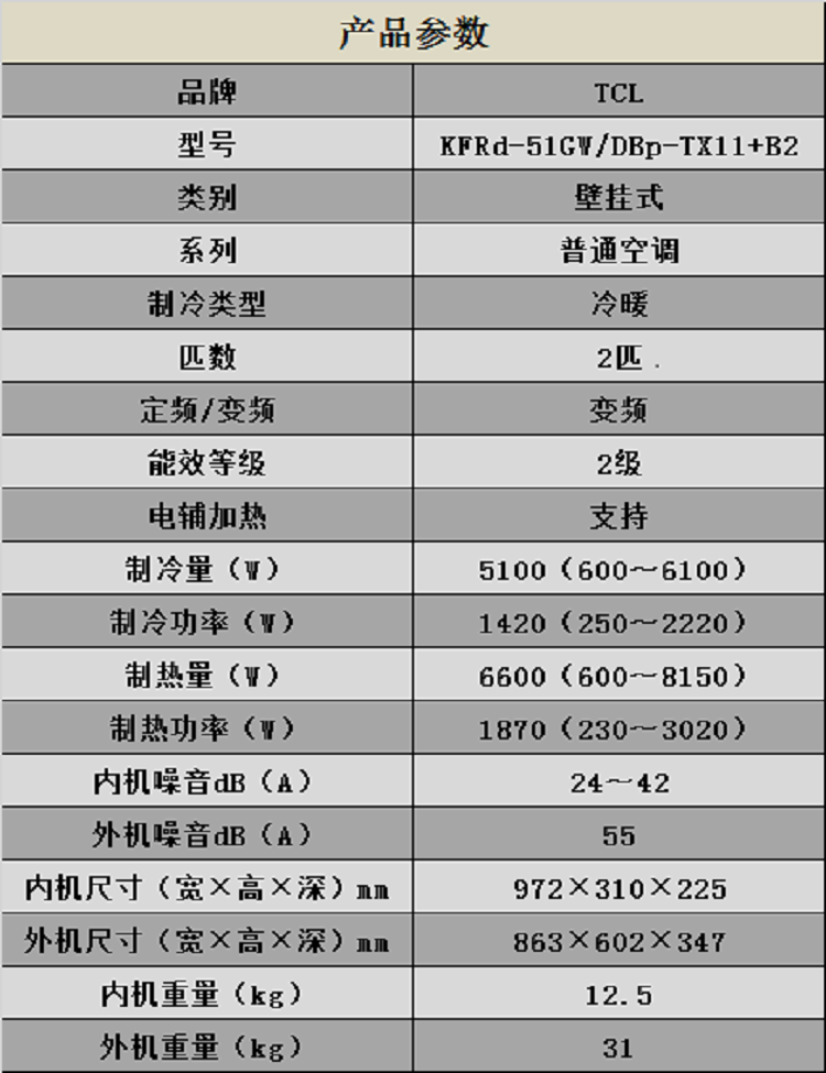 TCL空调 KFRd-51GW/DBp-TX11+B2 2匹冷暖变频壁挂式空调 单位:套 白色