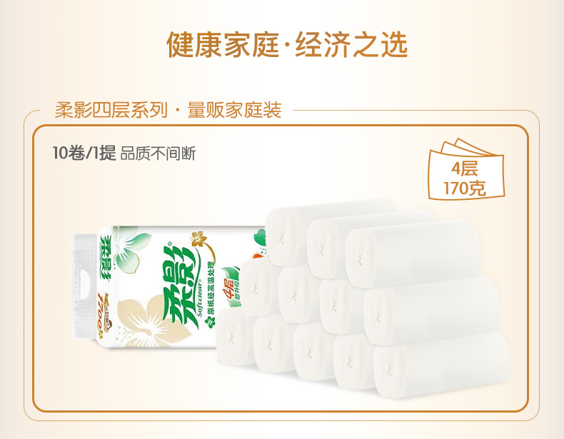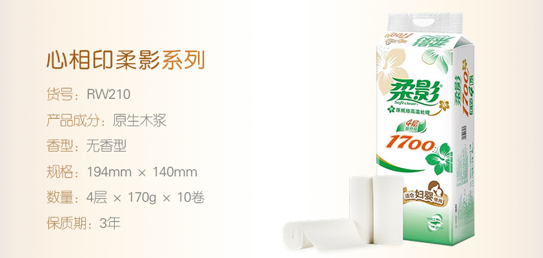 心相印 RW210(箱装)柔影170克10粒装四层无芯卫生纸10卷*5提(170g/卷) 白色
