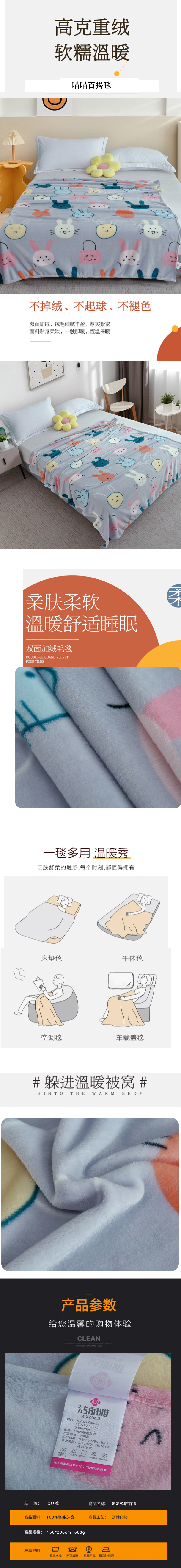 洁丽雅萌萌兔搭搭毯150*200CM(单位:床) 浅灰色