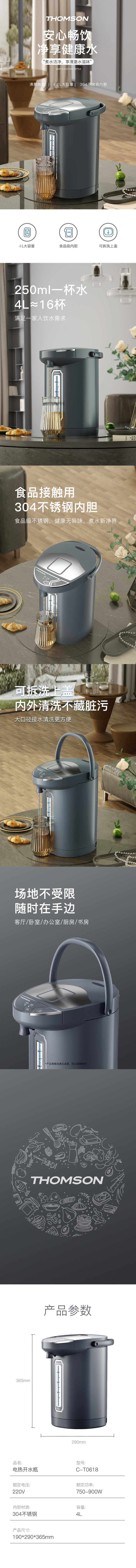 汤姆逊(THOMSON)电热开水瓶C-T0618 4L(单位:台) 灰色