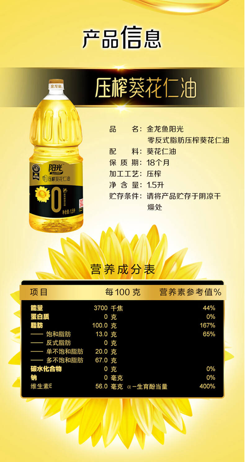 金龙鱼 阳光零反式脂肪压榨葵花仁油1.5L(单位:瓶)黄色