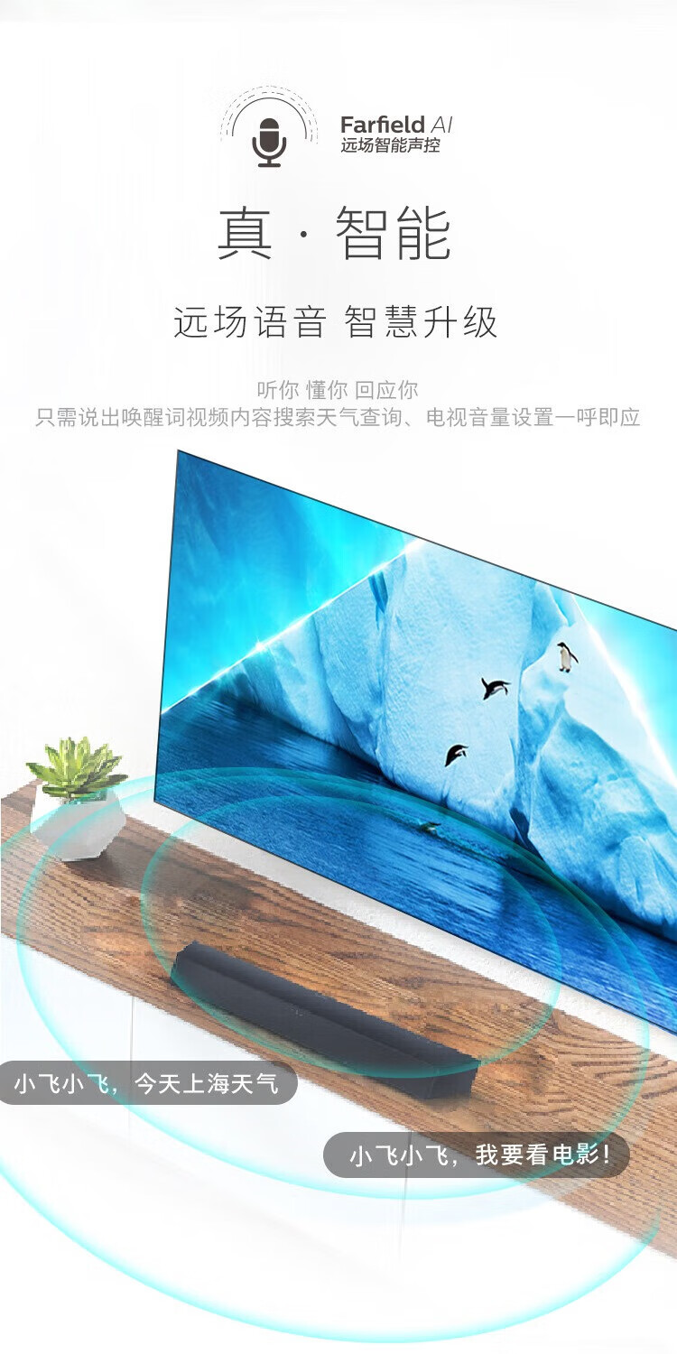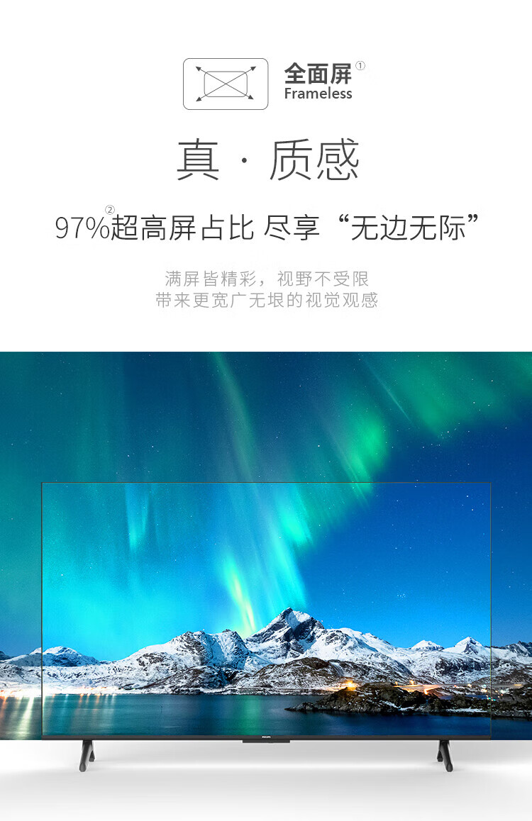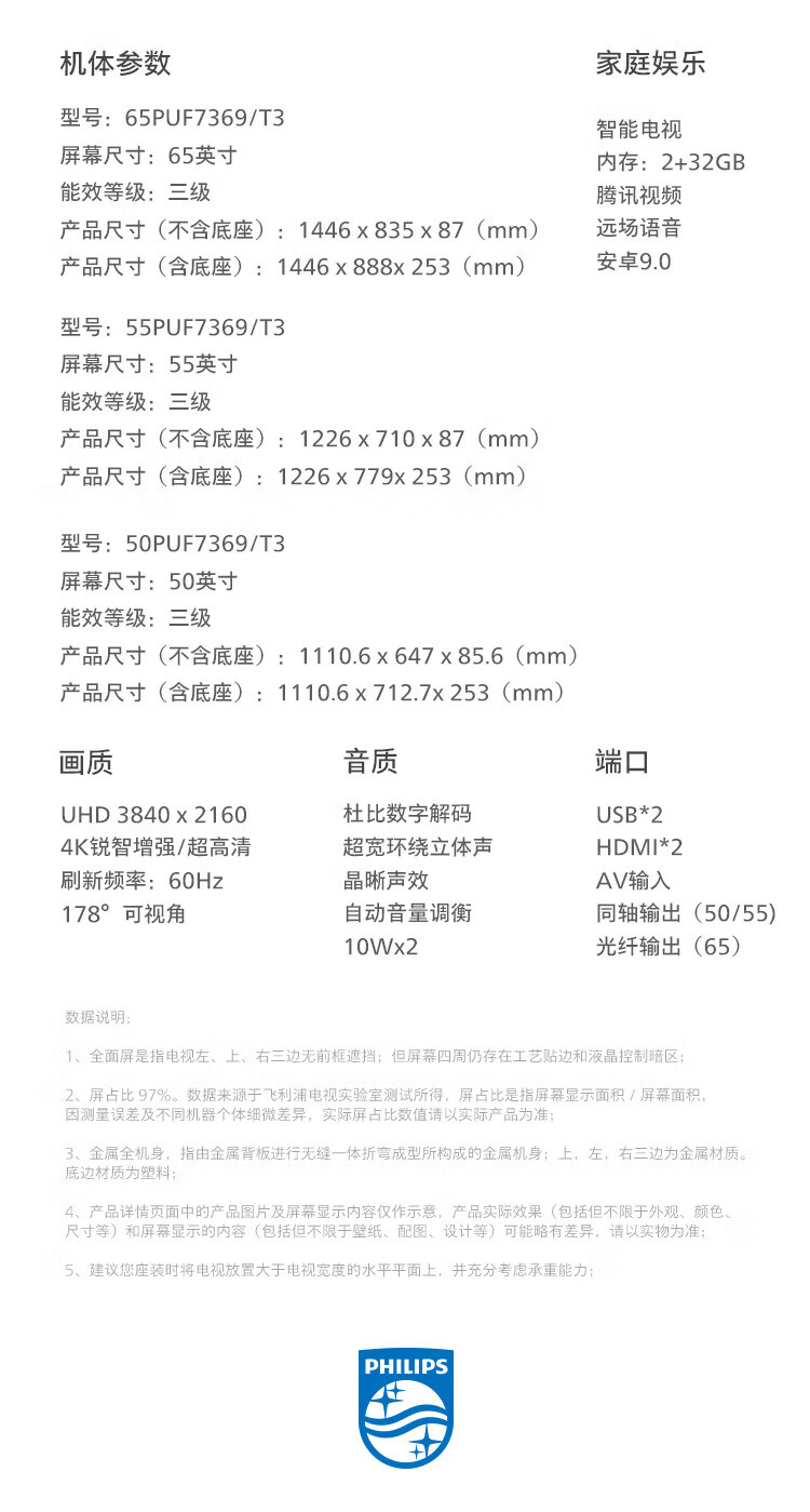 飞利浦65PUF7369/T3电视65寸4K超高清全面屏AI远场语音 2+32G单位:台 黑色