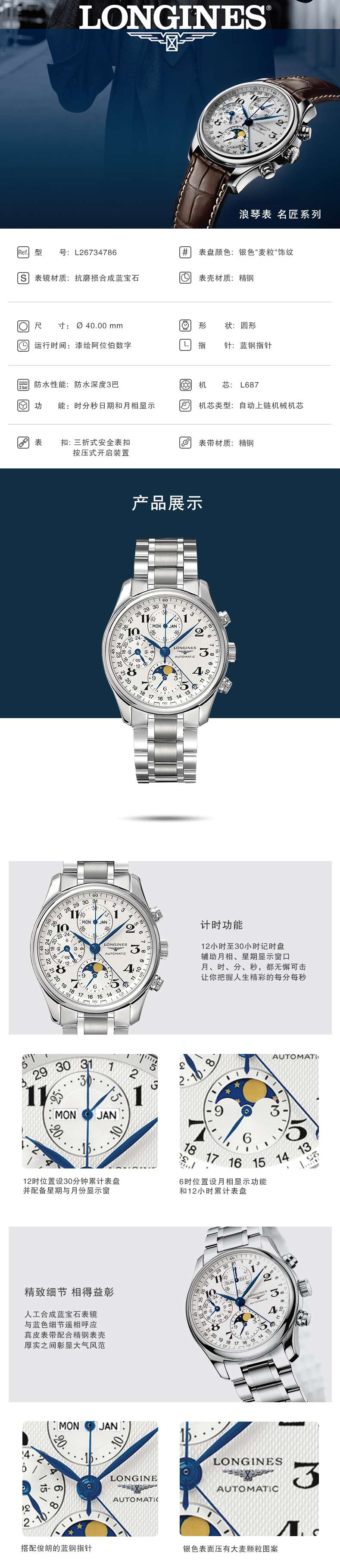 Longines浪琴 名匠系列月相手表钢带男表 L2.673.4.78.6(单位:块) 白色